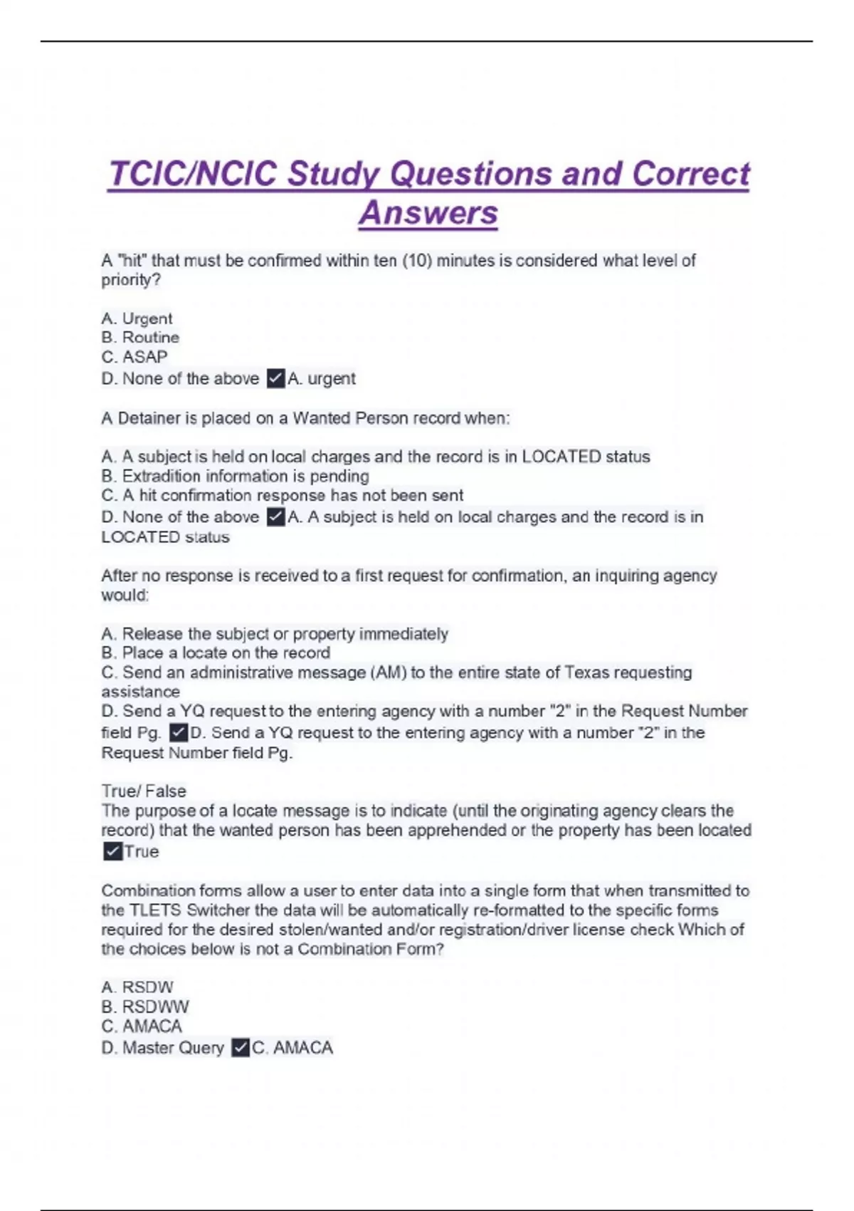 A "hit" that must be confirmed within ten (10) minutes is considered what level of priority? A. Urgent B. Routine C. ASAP D. None of the above A. urgent A Detainer is placed on a Wanted Person record when: A. A subject is held on local charges and the record is in LOCATED status B. Extradition information is pending C. A hit confirmation response has not been sent D. None of the above A. A subject is held on local charges and the record is in LOCATED status After no response is received to a first request for confirmation, an inquiring agency would: A. Release the subject or property immediately B. Place a locate on the record C. Send an administrative message (AM) to the entire state of Texas requesting assistance D. Send a YQ request to the entering agency with a number "2" in the Request Number field Pg. D. Send a YQ request to the entering agency with a number "2" in the Request Number field Pg. True/ False The purpose of a locate message is to indicate (until the originating agency clears the record) that the wanted person has been apprehended or the property has been located True Combination forms allow a user to enter data into a single form that when transmitted to the TLETS Switcher the data will be automatically re-formatted to the specific forms required for the desired stolen/wanted and/or registration/driver license check Which of the choices below is not a Combination Form? A. RSDW B. RSDWW C. AMACA D. Master Query C. AMACA The IQ format is used to check for a criminal record from a specific state. A. True B. False True A delayed hit inquiry is an administrative message ____ that is sent to the ORI of record when an inquiry, enter, or modify transaction results in a hit response. A. $.H B. $.L C. $.K D. $.E A. $H True/False The AQ transaction is used to request supplemental CHRI information not available through the normal IQ/FQ or to request information from a local agency. True When sending a Criminal History Full Record Query 'FQ' to a state, along with the two letter state code, purpose code and attention code what other field is required? A. Subject's Name B. State Identification Number C. FBI Number D. Reason Code B. State identification number True/False If a hit on a wanted person contains extradition limitations in the MIS field and the finding agency is outside the geographical area of extradition they should still place a locate on the record. False A Formal Message contains five distinct parts: A. Personnel, Agency, Radio Call Sign, Telecommunicator and Signature/Authority B. Per Requestor, Radio Call Sign, Text and Sagy Permission C. Preamble, Agency, Reference, Texas DPS and Signature/Authority D. Preamble, Address, Reference, Text and Signature/Authority D. Preamble, Address, Reference, Text and Signature/Authority The Signature/Authority of an Informal or a Formal Message: A. Must include a valediction such as "Sincerely" or "Thank you" B. Consists of the agency, the city/state and operators service C. Can include an officer's title and name or a specific division within an agency D. B & C D. B & C
