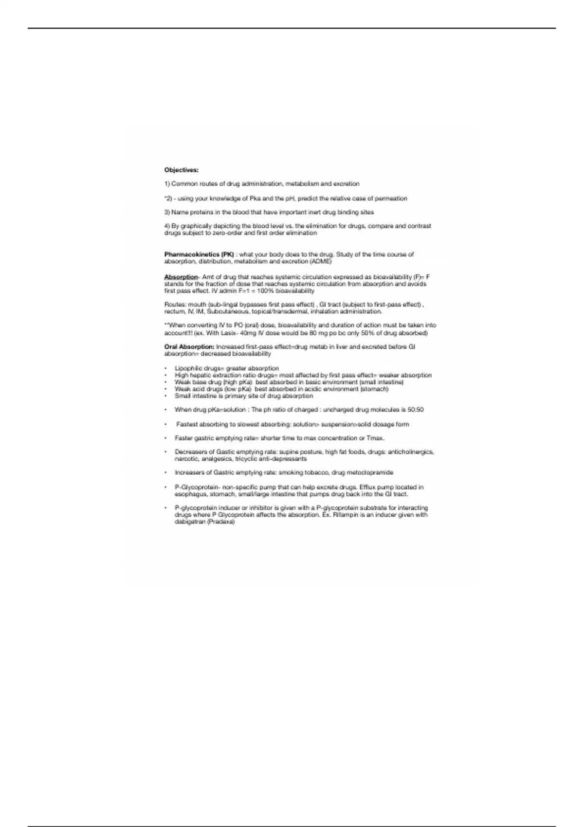 Absorption- Amt of drug that reaches systemic circulation expressed as bioavailability (F)= F