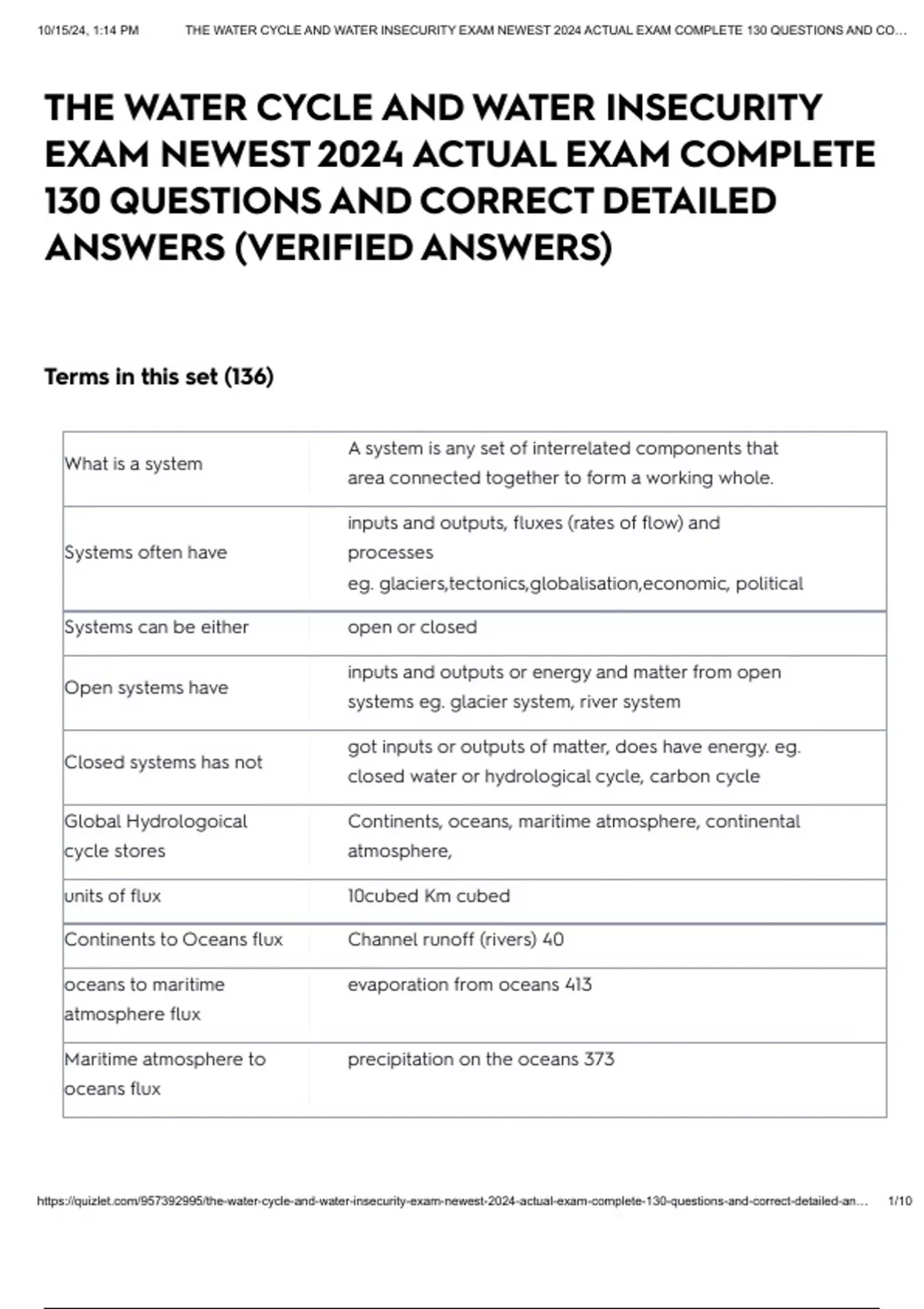 , 10/15/24, 1:14 PM THE WATER CYCLE AND WATER INSECURITY EXAM NEWEST 2024 ACTUAL EXAM COMPLETE 130 QUESTIONS AND CO…