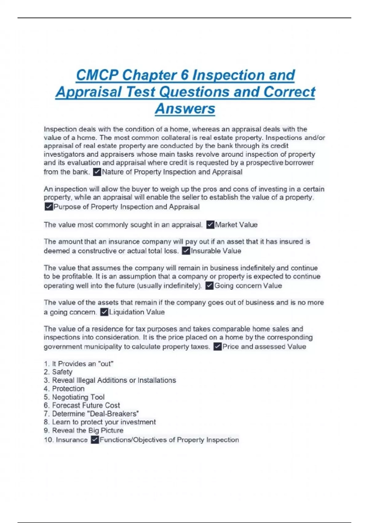CMCP Chapter 6 Inspection and Appraisal Test Questions and Correct Answers