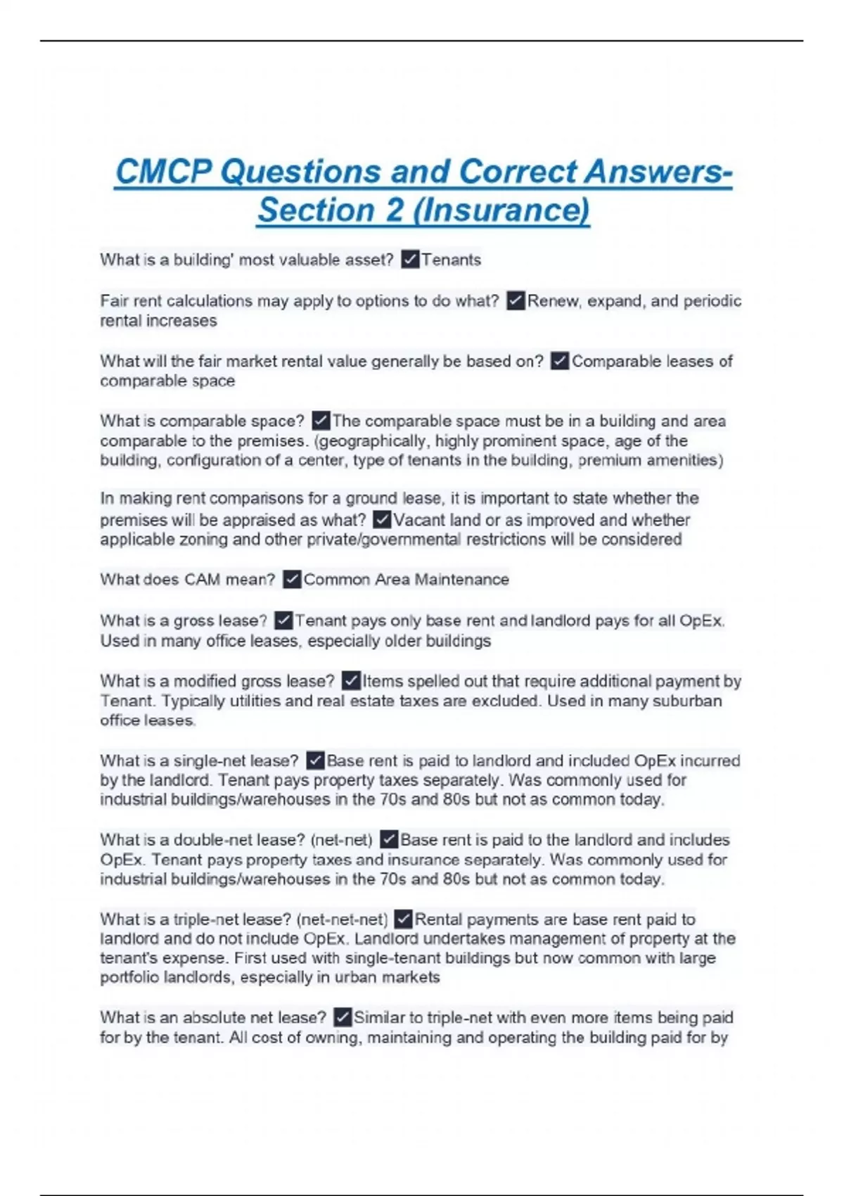 What is a building' most valuable asset? Tenants Fair rent calculations may apply to options to do what? Renew, expand, and periodic rental increases What will the fair market rental value generally be based on? Comparable leases of comparable space What is comparable space? The comparable space must be in a building and area comparable to the premises. (geographically, highly prominent space, age of the building, configuration of a center, type of tenants in the building, premium amenities) In making rent comparisons for a ground lease, it is important to state whether the premises will be appraised as what? Vacant land or as improved and whether applicable zoning and other private/governmental restrictions will be considered What does CAM mean? Common Area Maintenance What is a gross lease? Tenant pays only base rent and landlord pays for all OpEx. Used in many office leases, especially older buildings What is a modified gross lease? Items spelled out that require additional payment by Tenant. Typically utilities and real estate taxes are excluded. Used in many suburban office leases. What is a single-net lease? Base rent is paid to landlord and included OpEx incurred by the landlord. Tenant pays property taxes separately. Was commonly used for industrial buildings/warehouses in the 70s and 80s but not as common today. What is a double-net lease? (net-net) Base rent is paid to the landlord and includes OpEx. Tenant pays property taxes and insurance separately. Was commonly used for industrial buildings/warehouses in the 70s and 80s but not as common today. What is a triple-net lease? (net-net-net) Rental payments are base rent paid to landlord and do not include OpEx. Landlord undertakes management of property at the tenant's expense. First used with single-tenant buildings but now common with large portfolio landlords, especially in urban markets What is an absolute net lease? Similar to triple-net with even more items being paid for by the tenant. All cost of owning, maintaining and operating the building paid for by the tenant and usually paid directly to the providers of the services. Almost always used in a single-tenant building and in cases where the lease is primarily a financing tool