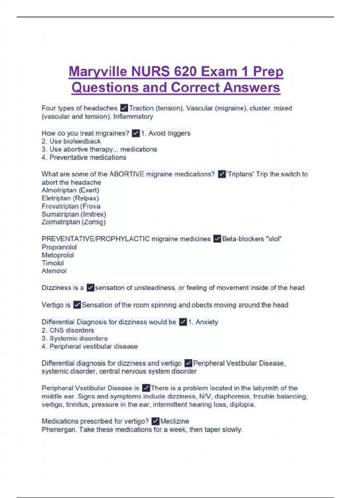Four types of headaches Traction (tension), Vascular (migraine), cluster, mixed (vascular and tension), Inflammatory How do you treat migraines? 1. Avoid triggers 2. Use biofeedback 3. Use abortive therapy... medications 4. Preventative medications What are some of the ABORTIVE migraine medications? 'Triptans' Trip the switch to abort the headache Almotriptan (Exert) Eletriptan (Relpax) Frovatriptan (Frova Sumatriptan (Imitrex) Zolmatriptan (Zomig) PREVENTATIVE/PROPHYLACTIC migraine medicines Beta-blockers "olol" Propranolol Metoprolol Timolol Atenolol Dizziness is a sensation of unsteadiness, or feeling of movement inside of the head Vertigo is Sensation of the room spinning and obects moving around the head Differential Diagnosis for dizziness would be 1. Anxiety 2. CNS disorders 3. Systemic disorders 4. Peripheral vestibular disease Differential diagnosis for dizziness and vertigo Peripheral Vestibular Disease, systemic disorder, central nervous system disorder Peripheral Vestibular Disease is There is a problem located in the labyrinth of the middle ear. Signs and symptoms include dizziness, N/V, diaphoresis, trouble balancing, vertigo, tinnitus, pressure in the ear, intermittent hearing loss, diplopia. Medications prescribed for vertigo? Meclizine Phenergan. Take these medications for a week, then taper slowly.
