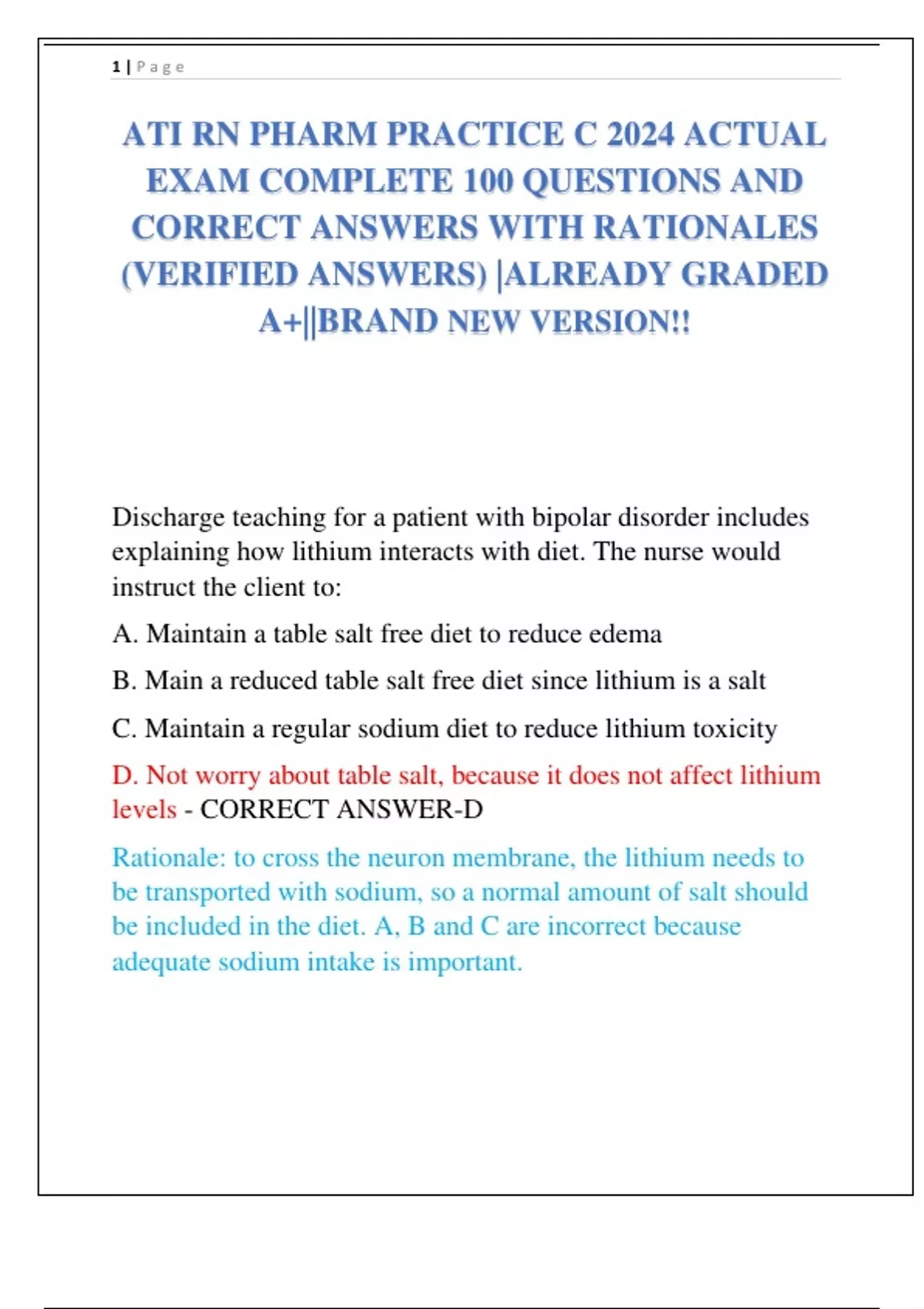 ATI RN PHARM PRACTICE C 2024 ACTUAL