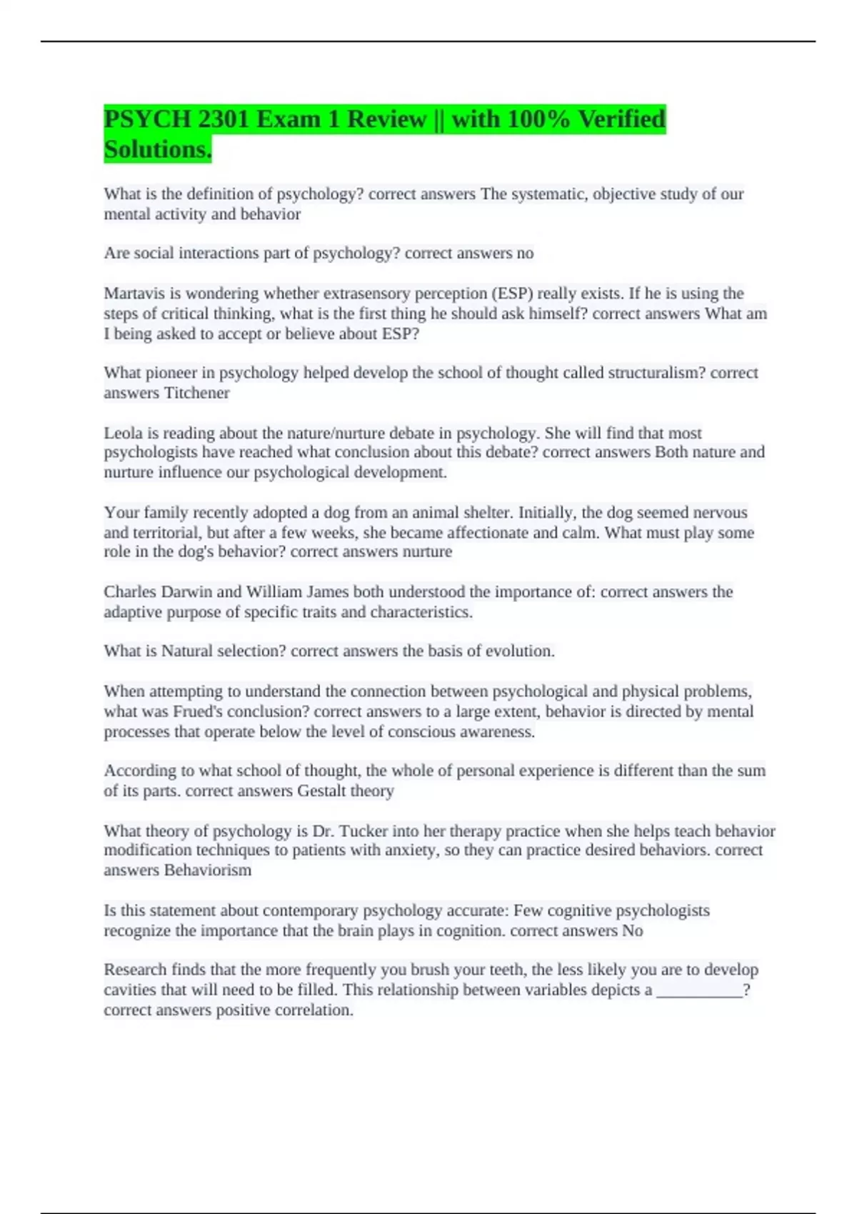 What is the definition of psychology? correct answers The systematic, objective study of our mental activity and behavior Are social interactions part of psychology? correct answers no Martavis is wondering whether extrasensory perception (ESP) really exists. If he is using the steps of critical thinking, what is the first thing he should ask himself? correct answers What am I being asked to accept or believe about ESP? What pioneer in psychology helped develop the school of thought called structuralism? correct answers Titchener Leola is reading about the nature/nurture debate in psychology. She will find that most psychologists have reached what conclusion about this debate? correct answers Both nature and nurture influence our psychological development. Your family recently adopted a dog from an animal shelter. Initially, the dog seemed nervous and territorial, but after a few weeks, she became affectionate and calm. What must play some role in the dog's behavior? correct answers nurture Charles Darwin and William James both understood the importance of: correct answers the adaptive purpose of specific traits and characteristics. What is Natural selection? correct answers the basis of evolution. When attempting to understand the connection between psychological and physical problems, what was Frued's conclusion? correct answers to a large extent, behavior is directed by mental processes that operate below the level of conscious awareness. According to what school of thought, the whole of personal experience is different than the sum of its parts. correct answers Gestalt theory What theory of psychology is Dr. Tucker into her therapy practice when she helps teach behavior modification techniques to patients with anxiety, so they can practice desired behaviors. correct answers Behaviorism Is this statement about contemporary psychology accurate: Few cognitive psychologists recognize the importance that the brain plays in cognition. correct answers No Research finds that the more frequently you brush your teeth, the less likely you are to develop cavities that will need to be filled. This relationship between variables depicts a __________? correct answers positive correlation.