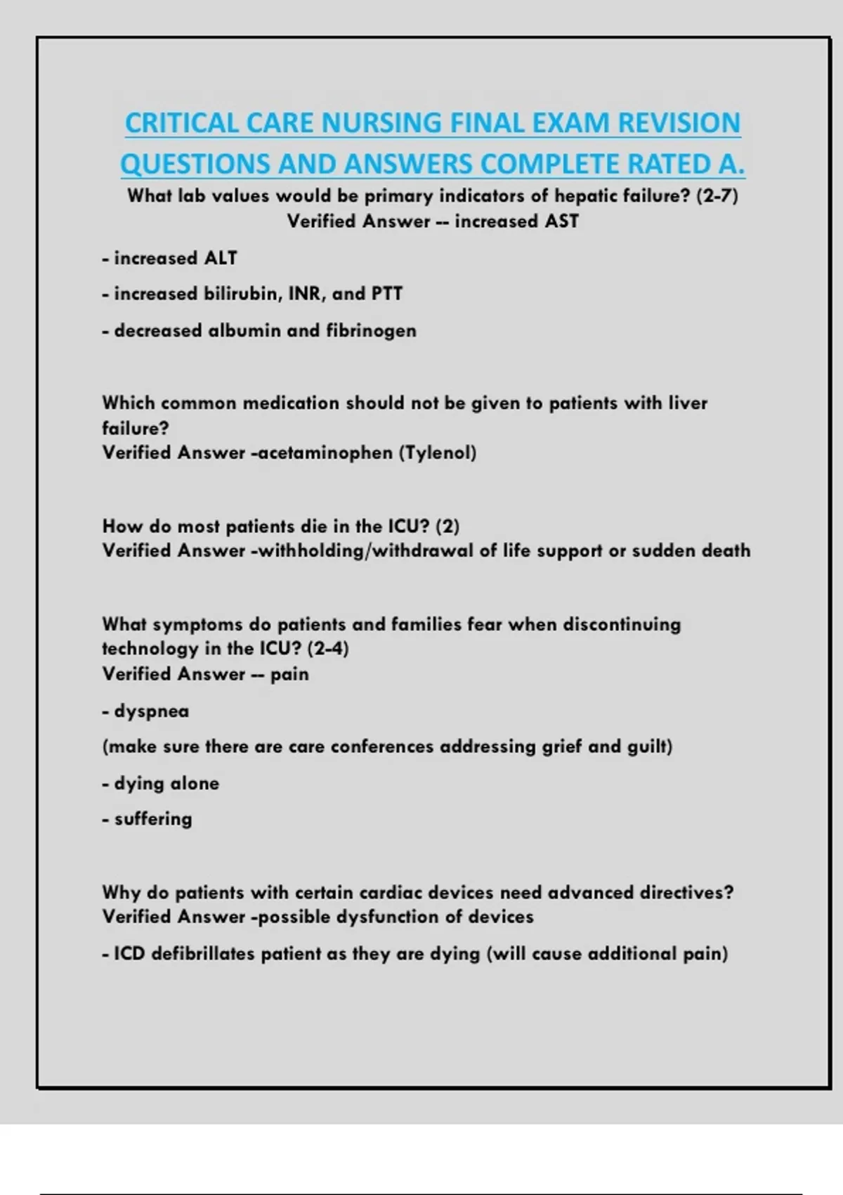 CRITICAL CARE NURSING FINAL EXAM REVISION QUESTIONS AND ANSWERS COMPLETE RATED A.