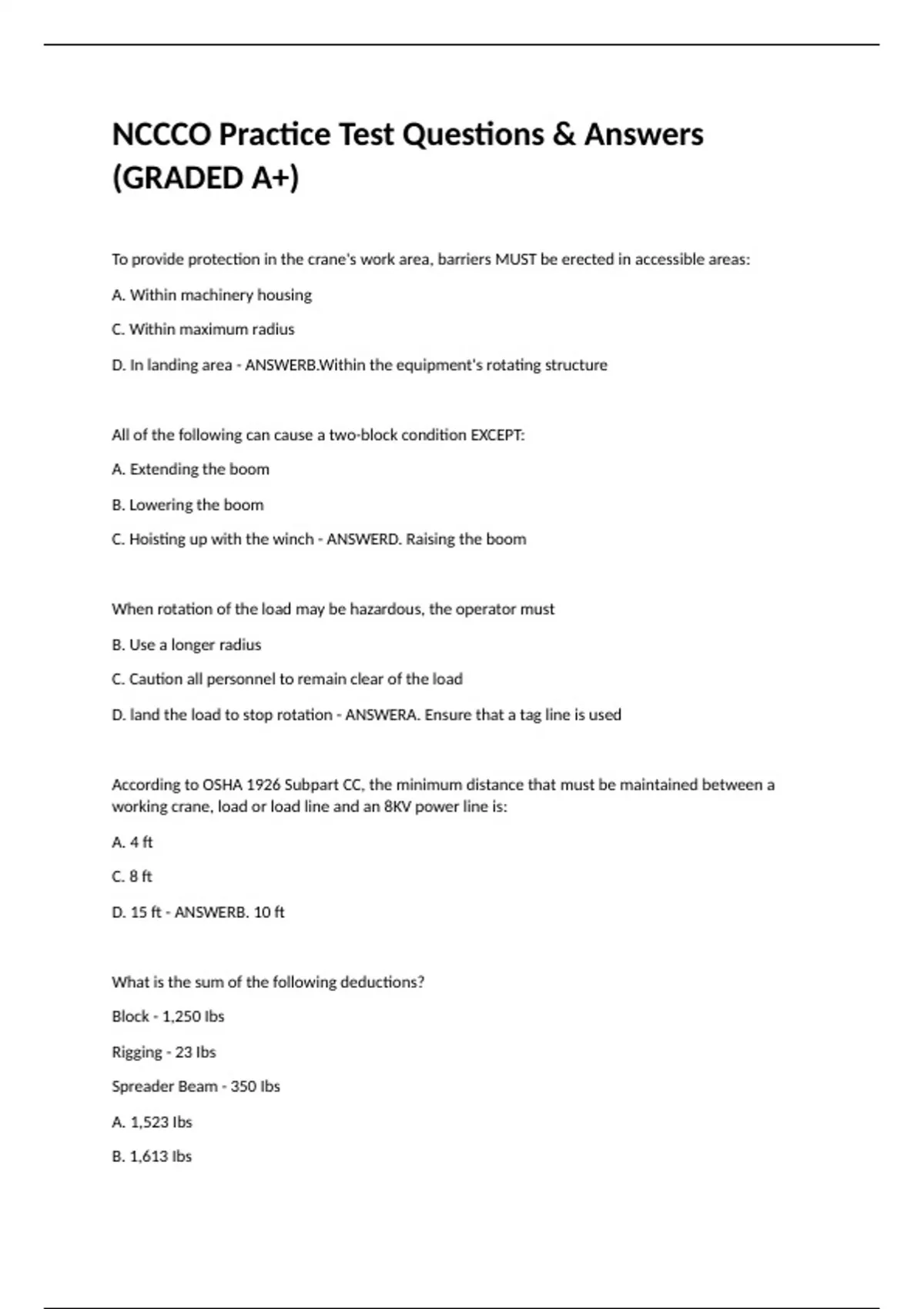 To provide protection in the crane's work area, barriers MUST be erected in accessible areas: A. Within machinery housing C. Within maximum radius D. In landing area - ANSWERB.Within the equipment's rotating structure All of the following can cause a two-block condition EXCEPT: A. Extending the boom B. Lowering the boom C. Hoisting up with the winch - ANSWERD. Raising the boom When rotation of the load may be hazardous, the operator must B. Use a longer radius C. Caution all personnel to remain clear of the load D. land the load to stop rotation - ANSWERA. Ensure that a tag line is used According to OSHA 1926 Subpart CC, the minimum distance that must be maintained between a working crane, load or load line and an 8KV power line is: A. 4 ft C. 8 ft D. 15 ft - ANSWERB. 10 ft