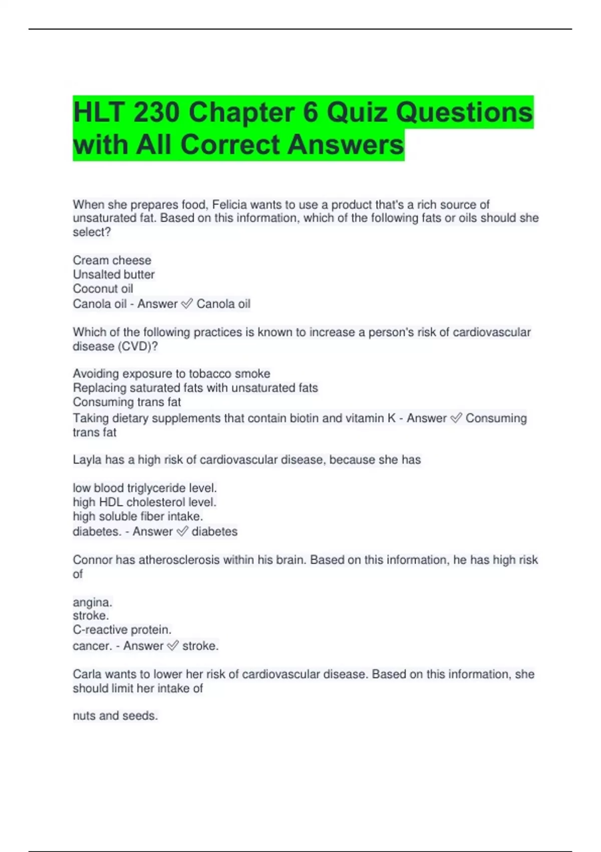HLT 230 Chapter 6 Quiz Questions with All Correct Answers When she prepares food, Felicia wants to use a product that's a rich source of unsaturated fat. Based on this information, which of the following fats or oils should she select? Cream cheese Unsalted butter Coconut oil Canola oil - Answer Canola oil Which of the following practices is known to increase a person's risk of cardiovascular disease (CVD)? Avoiding exposure to tobacco smoke Replacing saturated fats with unsaturated fats Consuming trans fat Taking dietary supplements that contain biotin and vitamin K - Answer Consuming trans fat Layla has a high risk of cardiovascular disease, because she has low blood triglyceride level. high HDL cholesterol level. high soluble fiber intake. diabetes. - Answer diabetes Connor has atherosclerosis within his brain. Based on this information, he has high risk of angina. stroke. C-reactive protein. cancer. - Answer stroke.