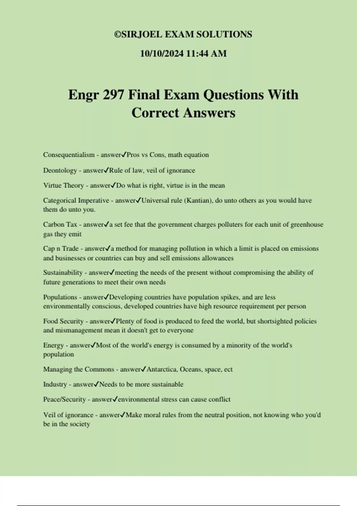 Engr 297 Final Exam Questions With Correct Answers Consequentialism - answerPros vs Cons, math equation Deontology - answerRule of law, veil of ignorance Virtue Theory - answerDo what is right, virtue is in the mean Categorical Imperative - answerUniversal rule (Kantian), do unto others as you would have them do unto you. Carbon Tax - answera set fee that the government charges polluters for each unit of greenhouse gas they emit Cap n Trade - answera method for managing pollution in which a limit is placed on emissions and businesses or countries can buy and sell emissions allowances Sustainability - answermeeting the needs of the present without compromising the ability of future generations to meet their own needs Populations - answerDeveloping countries have population spikes, and are less environmentally conscious, developed countries have high resource requirement per person Food Security - answerPlenty of food is produced to feed the world, but shortsighted policies and mismanagement mean it doesn't get to everyone Energy - answerMost of the world's energy is consumed by a minority of the world's population Managing the Commons - answerAntarctica, Oceans, space, ect Industry - answerNeeds to be more sustainable Peace/Security - answerenvironmental stress can cause conflict Veil of ignorance - answerMake moral rules from the neutral position, not knowing who you'd be in the society