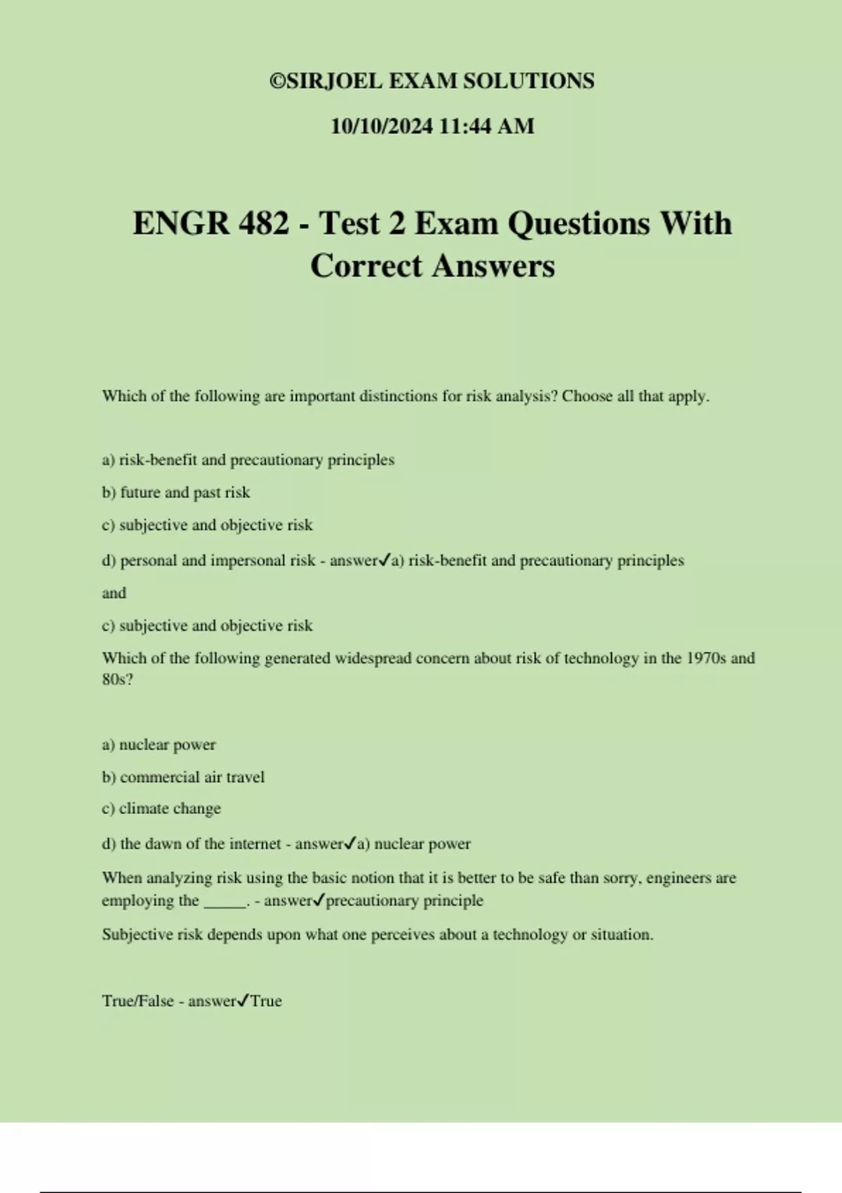 ENGR 482 - Test 2 Exam Questions With Correct Answers Which of the following are important distinctions for risk analysis? Choose all that apply. a) risk-benefit and precautionary principles b) future and past risk c) subjective and objective risk d) personal and impersonal risk - answera) risk-benefit and precautionary principles and c) subjective and objective risk Which of the following generated widespread concern about risk of technology in the 1970s and 80s? a) nuclear power b) commercial air travel c) climate change d) the dawn of the internet - answera) nuclear power When analyzing risk using the basic notion that it is better to be safe than sorry, engineers are employing the _____. - answerprecautionary principle Subjective risk depends upon what one perceives about a technology or situation. True/False - answerTrue ©SIRJOEL EXAM SOLUTIONS 10/10/2024 11:44 AM The risk-benefit principle uses... a) historical data to compare the risk between similar situations. b) the perception of consumers to evaluate the risk of a given situation or technology. c) the notion that it is better to be safe than sorry. d) quantitative information for weighing the benefits of a risk against its costs. - answerd) quantitative information for weighing the benefits of a risk against its costs. John thinks that there is a 50% chance of injury if he rides the ferris wheel. The actual risk of the injury on the ride is much lower, however. What can be said of John's thoughts regarding this situation? a) The objective risk of riding the ferris wheel is greater than the risk that John perceives. b) His sense of subjective risk is greater than the objective risk involved. c) It is impossible to answer this question based on the information provided. d) The subjective risk is the same as the objective risk. - answerb) His sense of subjective risk is greater than the objective risk involved. "The exact risk that a new pesticide X will have on people or the environment is uncertain. Rather than quantify the known risks, we are better off to not allow it to enter the market until the risks are more fully understood." This statement best illustrates... a) the risk-benefit principle b) objective risk c) subjective risk d) the precautionary principle - answerd) the precautionary principle The lottery experiment conducted by economist Maurice Allais indicates that... a) human beings always choose the option with the most potential benefit. ©SIRJOEL EXAM SOLUTIONS 10/10/2024 11:44 AM b) the precautionary principle is incompatible with risk analysis. c) the principle of maximizing expected value sometimes calls for individuals to make counter- intuitive choices. d) the risk-benefit and precautionary principles often come to the same conclusion about a certain risk. - answerc) the principle of maximizing expected value sometimes calls for individuals to make counter-intuitive choices. Which of the following are common objections made against risk-benefit analysis? Choose all that apply. a) it seems morally problematic to assign monetary value to the occurrence of a preventable death. b) risk-benefit analysis is often performed by individuals who are biased and stand to gain from certain results. c) risk-benefit analysis favors caution over innovation and hinders the implementation of new technologies. d) the numbers used in such quantitative analysis can be very uncertain. - answera) it seems morally problematic to assign monetary value to the occurrence of a preventable death. and... d) the numbers used in such quantitative analysis can be very uncertain. Which of these is NOT a common criticism of the Risk-Benefit Principle? a) The numbers used in a risk-benefit analysis are very often uncertain. b) The Risk-Benefit Principle does not adequately address reasonable intuitions about risk aversion. c) The Risk-Benefit Principle prevents progress because the calculations involved make it impossible to introduce novel designs. d) The Risk-Benefit Principle attempts to assign values to things that cannot be assessed in monetary terms. - answerc) The Risk-Benefit Principle prevents progress because the calculations involved make it impossible to introduce novel designs.