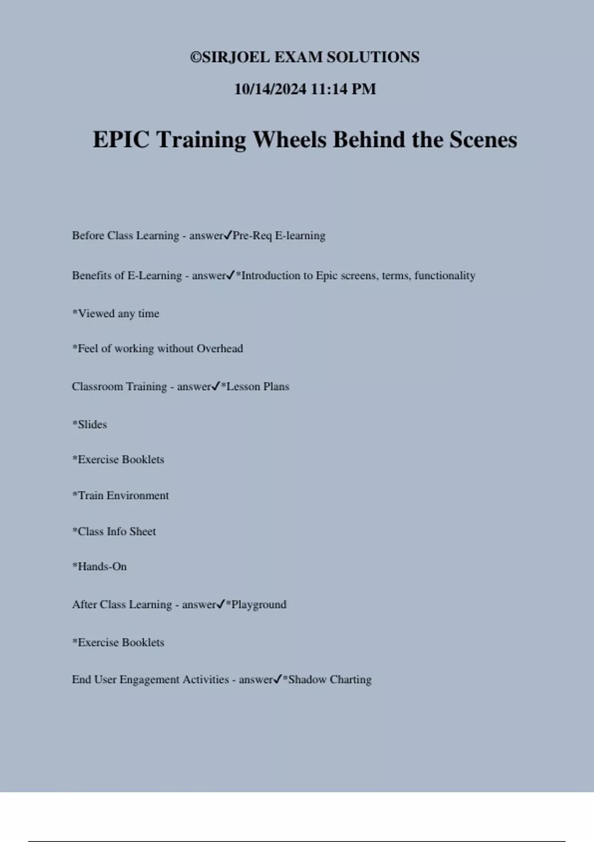 EPIC Training Wheels Behind the Scenes Before Class Learning - answerPre-Req E-learning Benefits of E-Learning - answer*Introduction to Epic screens, terms, functionality *Viewed any time *Feel of working without Overhead Classroom Training - answer*Lesson Plans *Slides *Exercise Booklets *Train Environment *Class Info Sheet *Hands-On After Class Learning - answer*Playground *Exercise Booklets End User Engagement Activities - answer*Shadow Charting