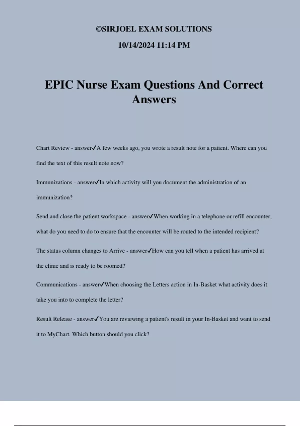 EPIC Nurse Exam Questions And Correct Answers Chart Review - answerA few weeks ago, you wrote a result note for a patient. Where can you find the text of this result note now? Immunizations - answerIn which activity will you document the administration of an immunization? Send and close the patient workspace - answerWhen working in a telephone or refill encounter, what do you need to do to ensure that the encounter will be routed to the intended recipient? The status column changes to Arrive - answerHow can you tell when a patient has arrived at the clinic and is ready to be roomed? Communications - answerWhen choosing the Letters action in In-Basket what activity does it take you into to complete the letter? Result Release - answerYou are reviewing a patient's result in your In-Basket and want to send it to MyChart. Which button should you click?