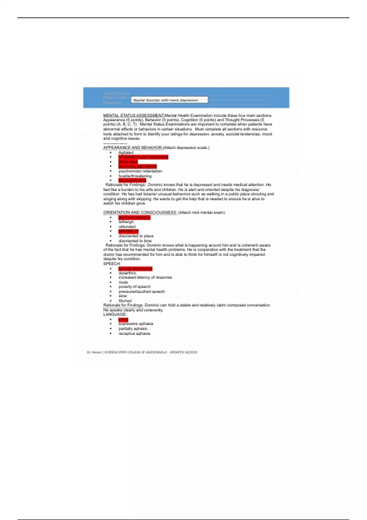 NUR 1212C Mental Status Exam template