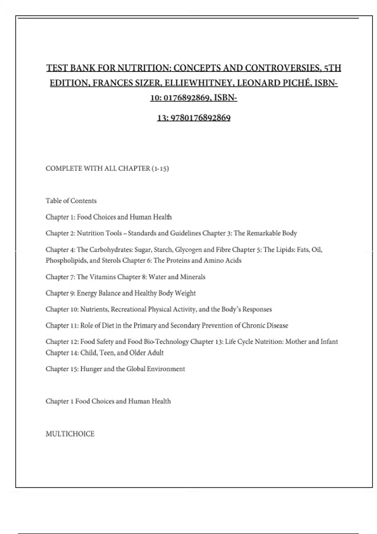 Test Bank for Nutrition: Concepts and Controversies, 16th Edition, Frances Sizer, Ellie Whitney, Leonard Piché, ISBN-10: , ISBN- 13: Download and Pass