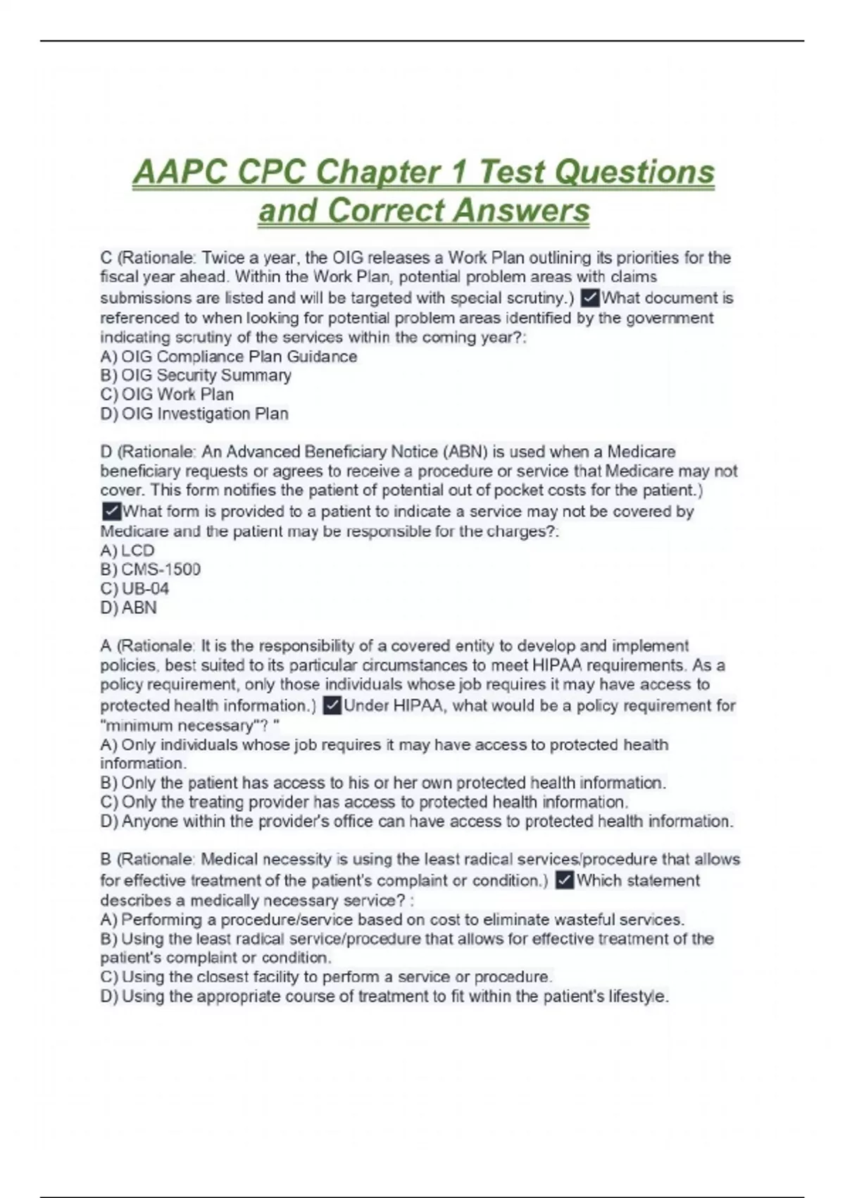 C (Rationale: Twice a year, the OIG releases a Work Plan outlining its priorities for the fiscal year ahead. Within the Work Plan, potential problem areas with claims submissions are listed and will be targeted with special scrutiny.) What document is referenced to when looking for potential problem areas identified by the government indicating scrutiny of the services within the coming year?: A) OIG Compliance Plan Guidance B) OIG Security Summary C) OIG Work Plan D) OIG Investigation Plan D (Rationale: An Advanced Beneficiary Notice (ABN) is used when a Medicare beneficiary requests or agrees to receive a procedure or service that Medicare may not cover. This form notifies the patient of potential out of pocket costs for the patient.) What form is provided to a patient to indicate a service may not be covered by Medicare and the patient may be responsible for the charges?: A) LCD B) CMS-1500 C) UB-04 D) ABN A (Rationale: It is the responsibility of a covered entity to develop and implement policies, best suited to its particular circumstances to meet HIPAA requirements. As a policy requirement, only those individuals whose job requires it may have access to protected health information.) Under HIPAA, what would be a policy requirement for "minimum necessary"? " A) Only individuals whose job requires it may have access to protected health information. B) Only the patient has access to his or her own protected health information. C) Only the treating provider has access to protected health information. D) Anyone within the provider's office can have access to protected health information. B (Rationale: Medical necessity is using the least radical services/procedure that allows for effective treatment of the patient's complaint or condition.) Which statement describes a medically necessary service? : A) Performing a procedure/service based on cost to eliminate wasteful services. B) Using the least radical service/procedure that allows for effective treatment of the patient's complaint or condition. C) Using the closest facility to perform a service or procedure. D) Using the appropriate course of treatment to fit within the patient's lifestyle. C (Rationale: According to the LCD, Chronic venous insufficiency is a systemic condition that may result in the need for routine foot care.) According to the example LCD from Novitas Solutions, which of the following conditions is considered a systemic condition that may result in the need for routine foot care? : A) arthritis B) chronic venous insufficiency C) hypertension D) muscle weakness C (Rationale: CMS instructions stipulate, "Notifiers must make a good faith effort to insert a reasonable estimate...the estimate should be within $100 or 25 percent of the actual costs, whichever is greater.") When presenting a cost estimate on an ABN for a potentially noncovered service, the cost estimate should be within what range of the actual cost? A) $25 or 10 percent B) $100 or 10 percent C) $100 or 25 percent D) An exact amount B Which act was enacted as part of the American Recovery and Reinvestment Act of 2009 (ARRA) and affected privacy and security? : A) HIPAA B) HITECH C) SSA D) PPACA A (Rationale: The