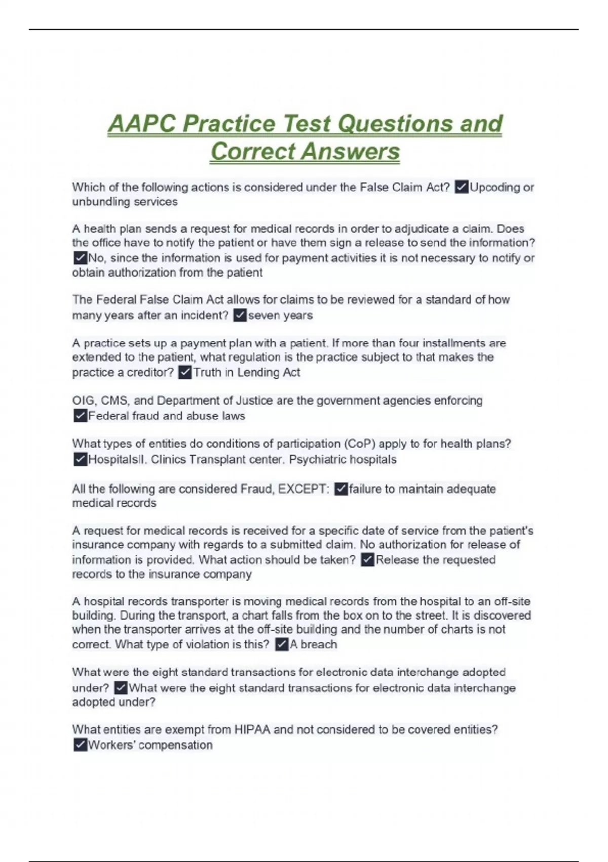 Which of the following actions is considered under the False Claim Act? Upcoding or unbundling services A health plan sends a request for medical records in order to adjudicate a claim. Does the office have to notify the patient or have them sign a release to send the information? No, since the information is used for payment activities it is not necessary to notify or obtain authorization from the patient The Federal False Claim Act allows for claims to be reviewed for a standard of how many years after an incident? seven years A practice sets up a payment plan with a patient. If more than four installments are extended to the patient, what regulation is the practice subject to that makes the practice a creditor? Truth in Lending Act OIG, CMS, and Department of Justice are the government agencies enforcing Federal fraud and abuse laws What types of entities do conditions of participation (CoP) apply to for health plans? HospitalsII. Clinics Transplant center. Psychiatric hospitals All the following are considered Fraud, EXCEPT: failure to maintain adequate medical records A request for medical records is received for a specific date of service from the patient's insurance company with regards to a submitted claim. No authorization for release of information is provided. What action should be taken? Release the requested records to the insurance company A hospital records transporter is moving medical records from the hospital to an off-site building. During the transport, a chart falls from the box on to the street. It is discovered when the transporter arrives at the off-site building and the number of charts is not correct. What type of violation is this? A breach What were the eight standard transactions for electronic data interchange adopted under? What were the eight standard transactions for electronic data interchange adopted under? What entities are exempt from HIPAA and not considered to be covered entities? Workers' compensation