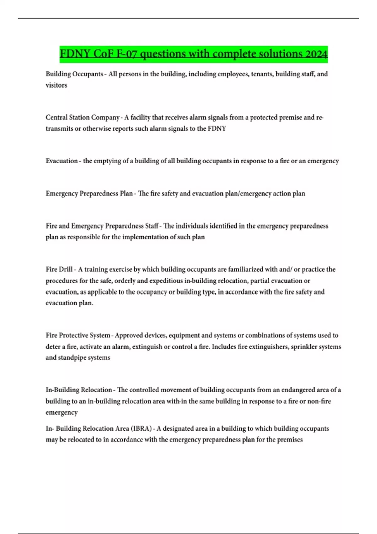 Building Occupants - All persons in the building, including employees, tenants, building staff, and visitors Central Station Company - A facility that receives alarm signals from a protected premise and re-transmits or otherwise reports such alarm signals to the FDNY Evacuation - the emptying of a building of all building occupants in response to a fire or an emergency Emergency Preparedness Plan - The fire safety and evacuation plan/emergency action plan Fire and Emergency Preparedness Staff - The individuals identified in the emergency preparedness plan as responsible for the implementation of such plan Fire Drill - A training exercise by which building occupants are familiarized with and/ or practice the procedures for the safe, orderly and expeditious in-building relocation, partial evacuation or evacuation, as applicable to the occupancy or building type, in accordance with the fire safety and evacuation plan. Fire Protective System - Approved devices, equipment and systems or combinations of systems used to deter a fire, activate an alarm, extinguish or control a fire. Includes fire extinguishers, sprinkler systems and standpipe systems In-Building Relocation - The controlled movement of building occupants from an endangered area of a building to an in-building relocation area with-in the same building in response to a fire or non-fire emergency In- Building Relocation Area (IBRA) - A designated area in a building to which building occupants may be relocated to in accordance with the emergency preparedness plan for the premises Manual Fire Alarm Box - A manually operated device used to initiate an alarm signal Mixed Occupancy Building - Buildings that have multiple occupancies. These are referred to as "mixed occupancies" and the different parts will be required to meet the fire code for each specific area. An example of this is a shopping mall with underground parking. The shopping area itself is Group M (mercantile), while the parking area would qualify as Group S (storage) Non-Fire Emergency - A biological chemical or nuclear ingredient or release (explosion, natural disaster or other emergency affecting premises) Non-Fire Emergency Drill - Training exercise practice procedures for evacuation Off-line - Those periods of time when a Central Station Company will, at the request of a building owner, not transmit fire alarm signals received from a building to the Fire Department. Fire alarm systems can be taken "off-line" only for Fire Department approved purposes associated with the prevention of unnecessary and unwarranted alarms. One-Way Voice Communication - Make announcements from lobby to building occupants in their apartments, offices, classrooms, etc. Owner - the fee owner or lessee of the building Partial Evacuation - the emptying of a building of some but not all building occupants in response to a fire or an emergency. Public Address System - an electronic sound amplification and distribution system with a microphone, amplifier and loudspeakers, used to allow a person to address a large public. Public Address systems enable voice communications from a central location, usually in the building lobby.