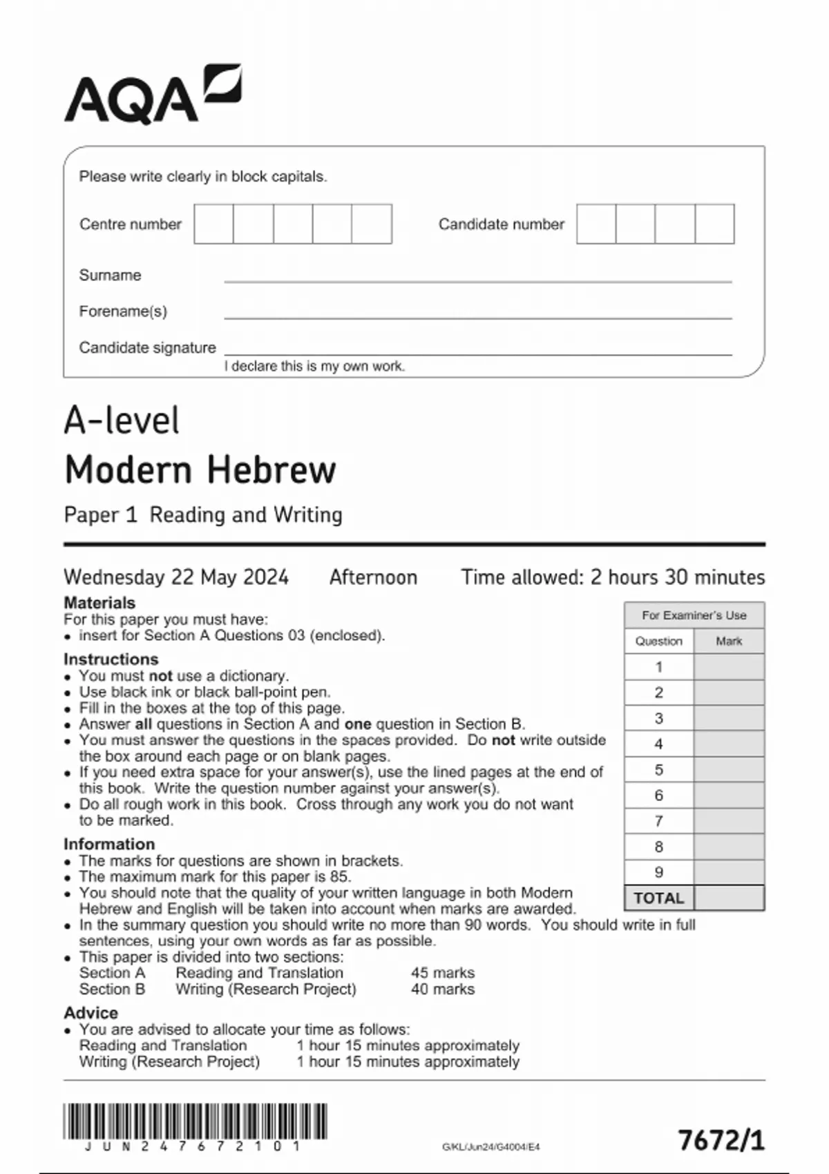 AQA A LEVEL MODERN HEBREW QUESTION PAPER 1 2024 (7672/1) Reading and Writing