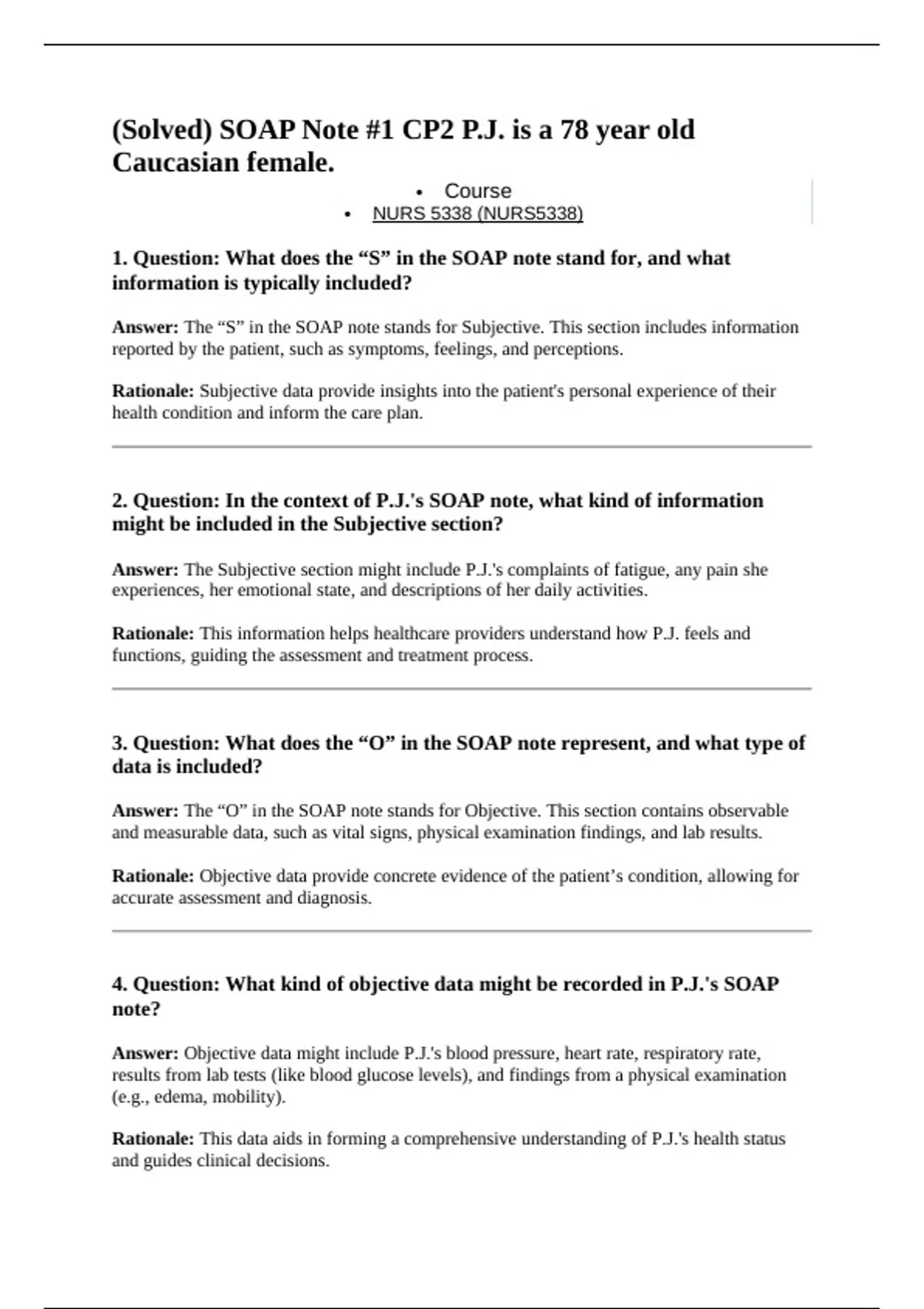 2. Question: In the context of P.J.'s SOAP note, what kind of information