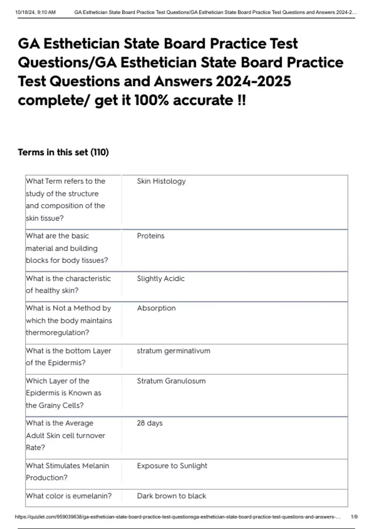 , 10/18/24, 9:10 AM GA Esthetician State Board Practice Test Questions/GA Esthetician State Board Practice Test Questions and Answers 2024-2…