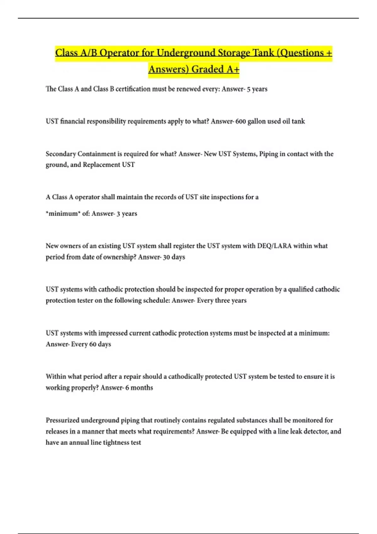 Class A/B Operator for Underground Storage Tank Exam Questions and Answers 2024