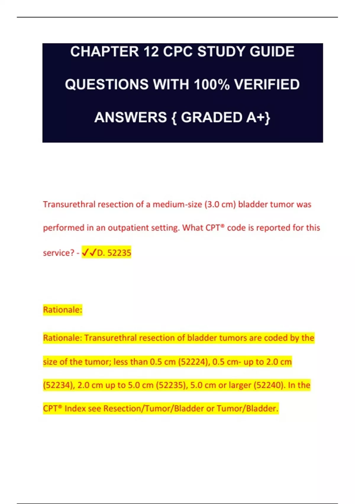 CHAPTER 12 CPC STUDY GUIDE QUESTIONS WITH 100% VERIFIED ANSWERS { GRADED A+} Transurethral resection of a medium-size (3.0 cm) bladder tumor was performed in an outpatient setting. What CPT® code is reported for this service? - D. 52235 Rationale: Rationale: Transurethral resection of bladder tumors are coded by the size of the tumor; less than 0.5 cm (52224), 0.5 cm- up to 2.0 cm (52234), 2.0 cm up to 5.0 cm (52235), 5.0 cm or larger (52240). In the CPT® Index see Resection/Tumor/Bladder or Tumor/Bladder.