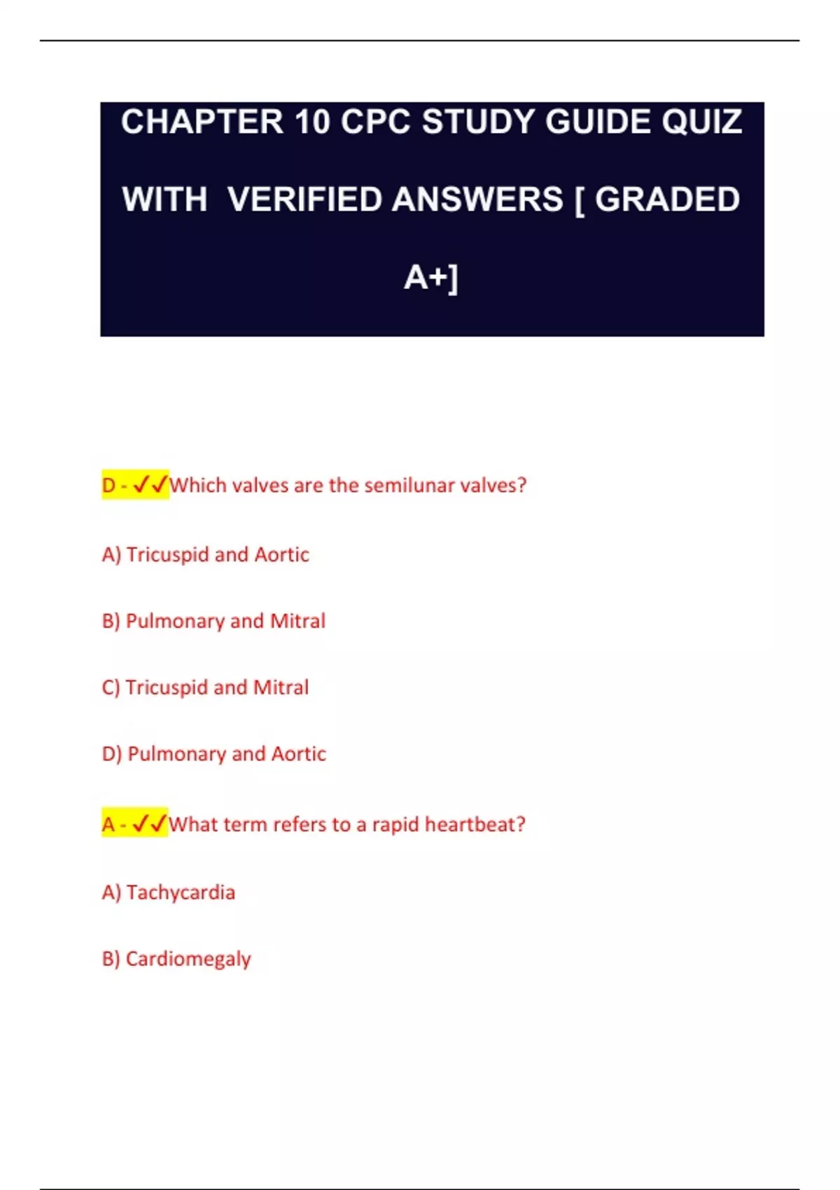 CHAPTER 10 CPC STUDY GUIDE QUIZ WITH VERIFIED ANSWERS [ GRADED A+] D - Which valves are the semilunar valves? A) Tricuspid and Aortic B) Pulmonary and Mitral C) Tricuspid and Mitral D) Pulmonary and Aortic A - What term refers to a rapid heartbeat? A) Tachycardia B) Cardiomegaly