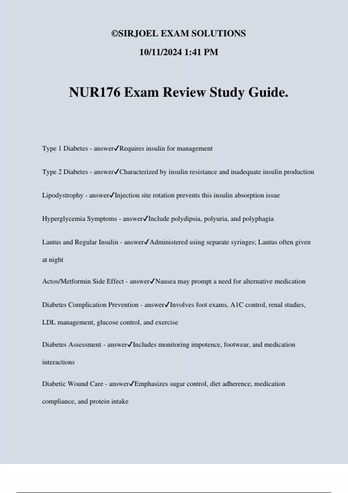 NUR176 Exam Review Study Guide. Type 1 Diabetes - answerRequires insulin for management Type 2 Diabetes - answerCharacterized by insulin resistance and inadequate insulin production Lipodystrophy - answerInjection site rotation prevents this insulin absorption issue Hyperglycemia Symptoms - answerInclude polydipsia, polyuria, and polyphagia Lantus and Regular Insulin - answerAdministered using separate syringes; Lantus often given at night Actos/Metformin Side Effect - answerNausea may prompt a need for alternative medication Diabetes Complication Prevention - answerInvolves foot exams, A1C control, renal studies, LDL management, glucose control, and exercise Diabetes Assessment - answerIncludes monitoring impotence, footwear, and medication interactions Diabetic Wound Care - answerEmphasizes sugar control, diet adherence, medication compliance, and protein intake ©SIRJOEL EXAM SOLUTIONS 10/11/2024 1:41 PM HIV Transmission to Baby - answerMay manifest up to 18 months post-birth HIV Medication Combination - answerDecreases resistance to treatment HIV Diet Recommendation - answerHigh calorie, protein, and potassium intake HIV Diagnosis Test - answerInvolves CD-4 count and viral blood tests HIV Lesions in Mouth - answerManaged with straws and increased fluid intake Pediculosis Teaching - answerInvolves frequent hair washing, nit removal, and Vaseline application Stroke Types - answerInclude ischemic and hemorrhagic forms Stroke Patient Care - answerInvolves no straws, thickened liquids, and mobility aid education ICP Early Symptoms - answerInclude altered consciousness, restlessness, and visual disturbances Stroke Prevention Measures - answerIncorporate increased activity, smoking cessation, and compression socks Dysphagia Precautions - answerInclude avoiding straws and thickening liquids Renal Diet - answerEmphasizes low intake and green leafy vegetables