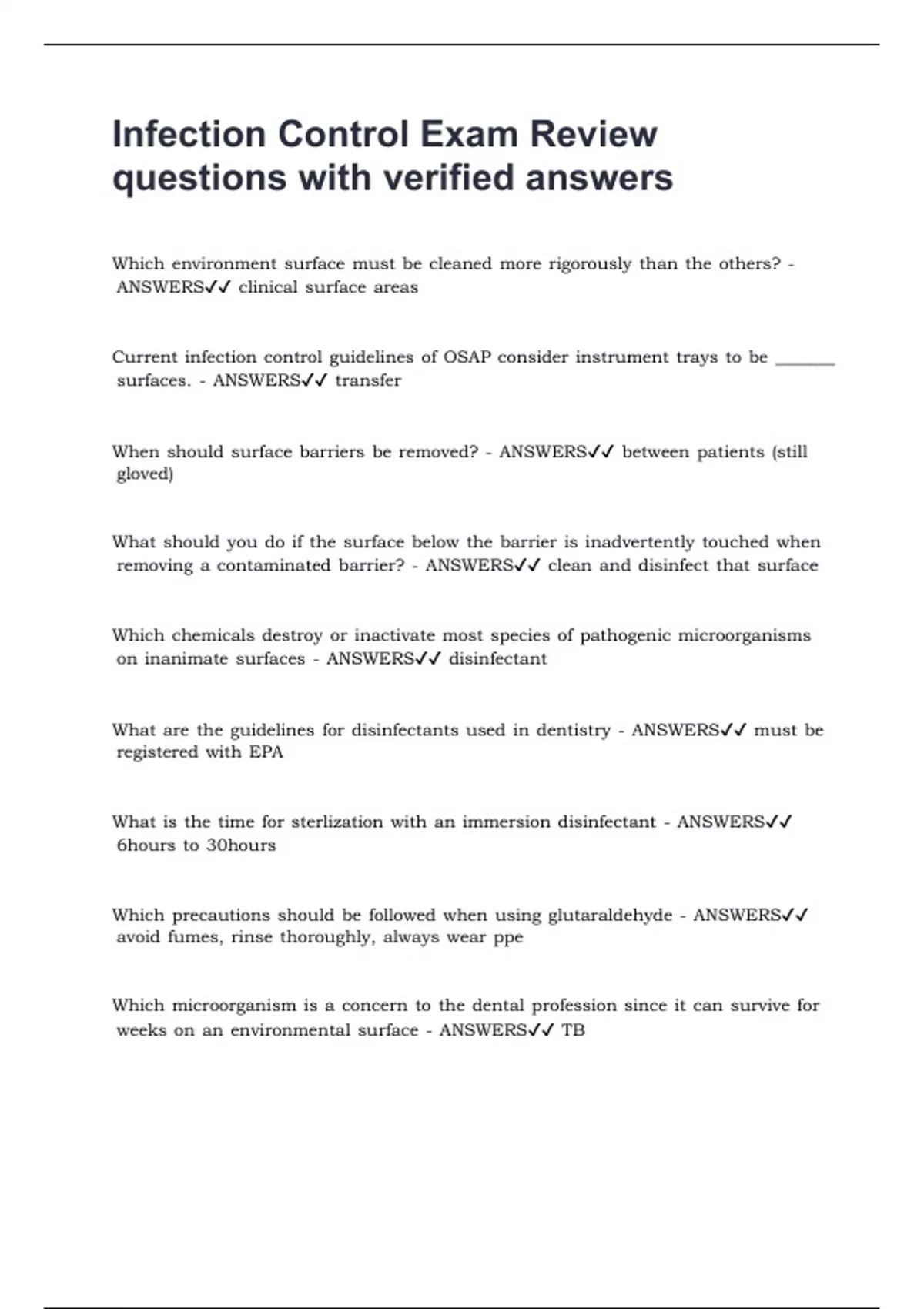 Infection Control Exam Review questions with verified answers