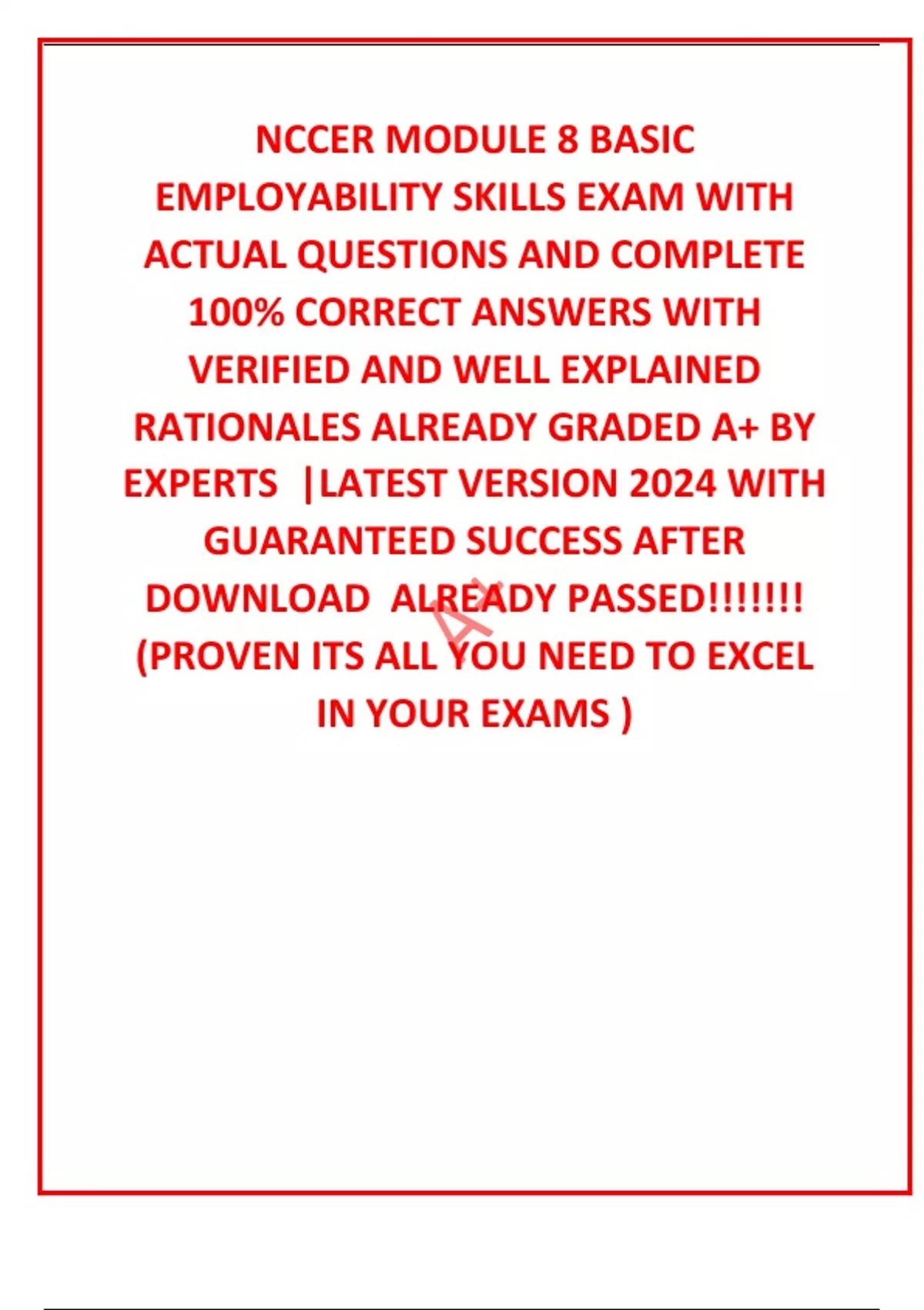 NCCER MODULE 8 BASIC EMPLOYABILITY SKILLS EXAM WITH ACTUAL QUESTIONS AND COMPLETE 100% CORRECT ANSWERS WITH VERIFIED AND WELL EXPLAINED RATIONALES ALREADY GRADED A+ BY EXPERTS |LATEST VERSION 2024 WITH GUARANTEED SUCCESS AFTER DOWNLOAD ALREADY PASSED!!