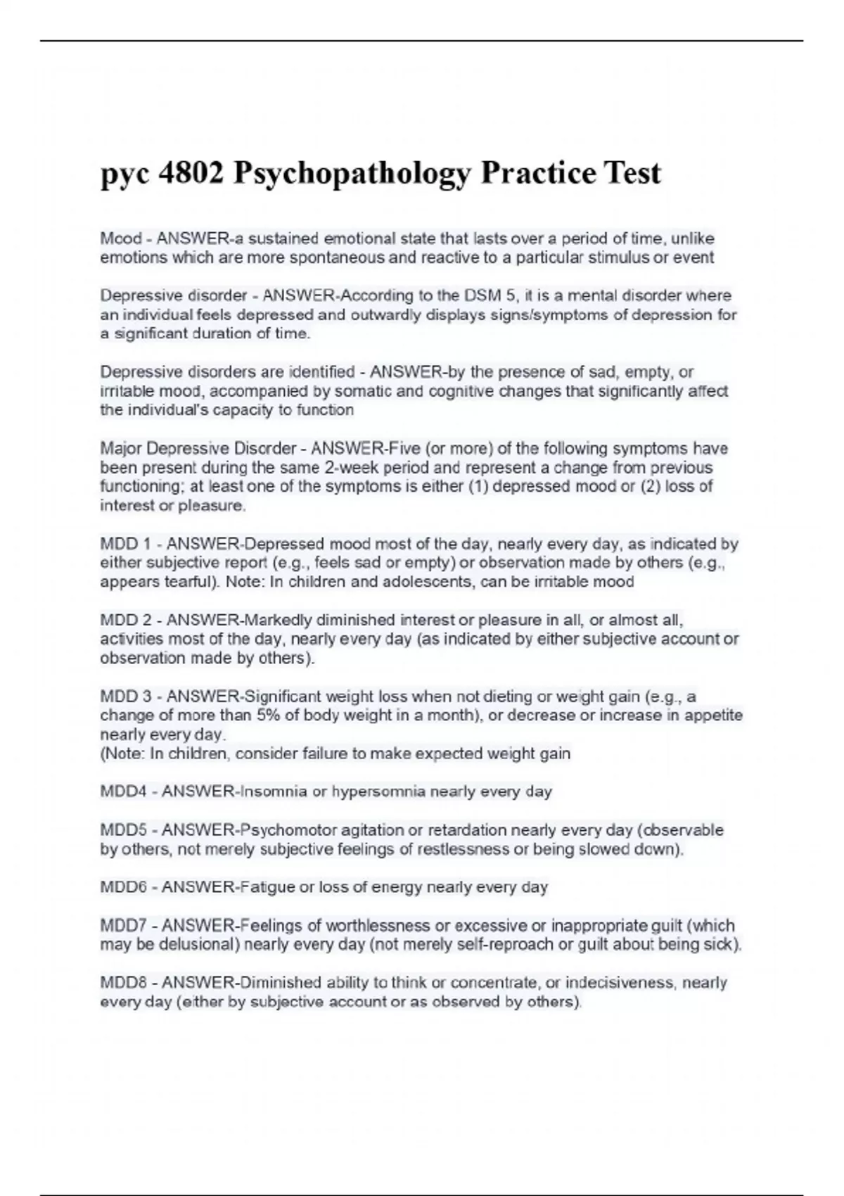 pyc 4802 Psychopathology Practice Test Mood - ANSWER-a sustained emotional state that lasts over a period of time, unlike emotions which are more spontaneous and reactive to a particular stimulus or event Depressive disorder - ANSWER-According to the DSM 5, it is a mental disorder where an individual feels depressed and outwardly displays signs/symptoms of depression for a significant duration of time. Depressive disorders are identified - ANSWER-by the presence of sad, empty, or irritable mood, accompanied by somatic and cognitive changes that significantly affect the individual's capacity to function Continues.......