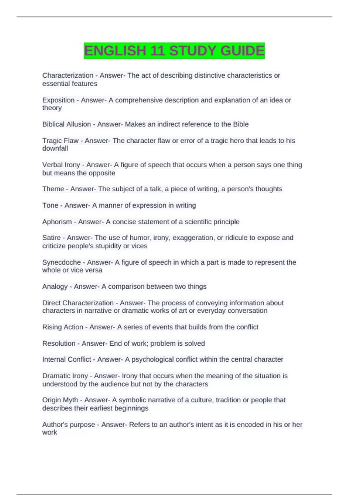 ENGLISH 11 STUDY GUIDE Characterization - Answer- The act of describing distinctive characteristics or essential features Exposition - Answer- A comprehensive description and explanation of an idea or theory Biblical Allusion - Answer- Makes an indirect reference to the Bible Tragic Flaw - Answer- The character flaw or error of a tragic hero that leads to his downfall Verbal Irony - Answer- A figure of speech that occurs when a person says one thing but means the opposite Theme - Answer- The subject of a talk, a piece of writing, a person's thoughts Tone - Answer- A manner of expression in writing Aphorism - Answer- A concise statement of a scientific principle Satire - Answer- The use of humor, irony, exaggeration, or ridicule to expose and criticize people's stupidity or vices Synecdoche - Answer- A figure of speech in which a part is made to represent the whole or vice versa Analogy - Answer- A comparison between two things Direct Characterization - Answer- The process of conveying information about characters in narrative or dramatic works of art or everyday conversation Rising Action - Answer- A series of events that builds from the conflict Resolution - Answer- End of work; problem is solved Internal Conflict - Answer- A psychological conflict within the central character Dramatic Irony - Answer- Irony that occurs when the meaning of the situation is understood by the audience but not by the characters Origin Myth - Answer- A symbolic narrative of a culture, tradition or people that describes their earliest beginnings Author's purpose - Answer- Refers to an author's intent as it is encoded in his or her work
