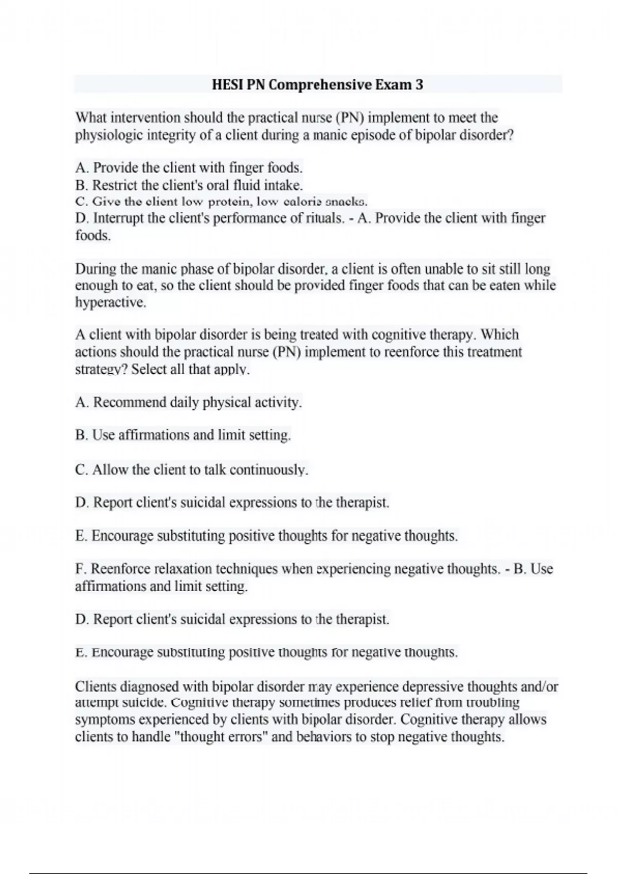 What intervention should the practical nurse (PN) implement to meet the physiologic integrity of a client during a manic episode of bipolar disorder? A. Provide the client with finger foods. B. Restrict the client's oral fluid intake. C. Give the client low-protein, low-calorie snacks. D. Interrupt the client's performance of rituals. - A. Provide the client with finger foods. During the manic phase of bipolar disorder, a client is often unable to sit still long enough to eat, so the client should be provided finger foods that can be eaten while hyperactive. A client with bipolar disorder is being treated with cognitive therapy. Which actions should the practical nurse (PN) implement to reenforce this treatment strategy? Select all that apply. A. Recommend daily physical activity. B. Use affirmations and limit setting. C. Allow the client to talk continuously. D. Report client's suicidal expressions to the therapist. E. Encourage substituting positive thoughts for negative thoughts. F. Reenforce relaxation techniques when experiencing negative thoughts. - B. Use affirmations and limit setting. D. Report client's suicidal expressions to the therapist. E. Encourage substituting positive thoughts for negative thoughts. Clients diagnosed with bipolar disorder may experience depressive thoughts and/or attempt suicide. Cognitive therapy sometimes produces relief from troubling symptoms experienced by clients with bipolar disorder. Cognitive therapy allows clients to handle "thought errors" and behaviors to stop negative thoughts. The practical nurse (PN) is evaluating a client's self management of type 1 diabetes mellitus (DM). Which findings provide the best parameter in the client's goals for the prevention of long-term complications of DM? A. Strict adherence to a diabetic diet. B. Participation in a regular exercise program. C. Scheduled administration of accurate insulin doses. D. Consistent hemoglobin A1c levels no greater than 7%. - D. Consistent hemoglobin A1c levels no greater than 7%. For optimal diabetic control, evidence-based guidelines recommend an A1c target level no greater than 7% for a client with DM, which is the primary goal and indicator of effective treatment and diabetes management. Which action should the practical nurse (PN) implement for a young girl with pulmonary infection who is receiving chest physiotherapy? A. Encourage to hold her breath and then cough. B. Administer bronchodilators after the procedure. C. Allow the child to sit in a position of choice. D. Percuss the chest wall in a rhythmic fashion. - D. Percuss the chest wall in a rhythmic fashion. Thick secretions that are difficult to cough up can be loosened by tapping, or percussing, and vibrating the chest. Percussion is carried out by cupping the hands and lightly striking the chest wall in a rhythmic fashion over the lung segment to be drained The practical nurse (PN) is preparing to administer erythromycin (Ilotycin) 0.5% ophthalmic ointment to a newborn. The father asks the PN the purpose of this medication. What rationale should the PN provide? A. To allow the baby's eyes to focus. B. To lubricate the baby's eyes. C. To prevent infection in the baby's eyes. D. Refer the father to the pediatrician. - C. To prevent infection in the baby's eyes. Erythromycin is prescribed in the prophylaxis of ophthalmia neonatorum caused by Neisseria gonorrhea and Chlamydia trachomatis. The PN should explain the ointment is a prophylactic treatment to prevent infection in the baby's eyes. A client's cardiac telemetry reveals sinus bradycardia at 40 beats/minute. An IV dose of atropine is given per protocol. Which finding should the practical nurse (PN) identify as a therapeutic response? A. A decrease in blood pressure. B. A decrease in premature contractions. C. An increase in heart rate. D. An increase in sensorium. - C. An increase in heart rate. Atropine increases heart rate (C) by its anticholinergic effects on the sinoatrial (SA) node. A client is admitted with a tumor of the hypothalamus. Which finding should the practical nurse (PN) report to the charge nurse? A. A pulse rate of 98 beats/min. B. Respirations of 20 breaths/min. C. An oral temperature of 101.8° F. D. A blood pressure of 130/80 mm Hg. - C. An oral temperature of 101.8° F. The hypothalamus controls body temperature, so variation in the temperature should be reported to determine if the elevation is related to infection or cerebral pathology. The practical nurse (PN) is reinforcing instructions to a client who is scheduled for a bone marrow aspiration. The PN should prepare the client for the procedure at which site? A. The femur. B. The scapula. C. The antecubital fossa. D. The posterior iliac crest. - D. The posterior iliac crest. Bone marrow samples are commonly aspirated from the posterior iliac crest or sternum, which are readily accessible obtaining a specimen of bone marrow via the biopsy needle. Which discharge instructions should the practical nurse (PN) reinforce with a client who has acute cholecystitis? A. Limit oral intake to three regular meals per day. B. Drink fluids between meals rather than with meals. C. Consume a low-fat diet in smaller, more frequent meals. D. Limit dietary fat intake to 35% of the daily calorie intake. - C. Consume a lowfat diet in smaller, more frequent meals. Clients with acute cholecystitis are placed on small, frequent low-fat meals to decrease contraction of the gallbladder, thus decreasing pain, nausea, and vomiting. A male client draws back when the practical nurse (PN) reaches over the side rails to take his blood pressure. To promote effective communication, what should the PN do? A. Continue to perform the procedure quickly and quietly. B. Apologize for startling the client and explain the need for contact. C. Tell the client that the blood pressure can be taken at a later time. D. Rotate the nurses who are assigned to take the client's blood pressure. - B. Apologize for startling the client and ex