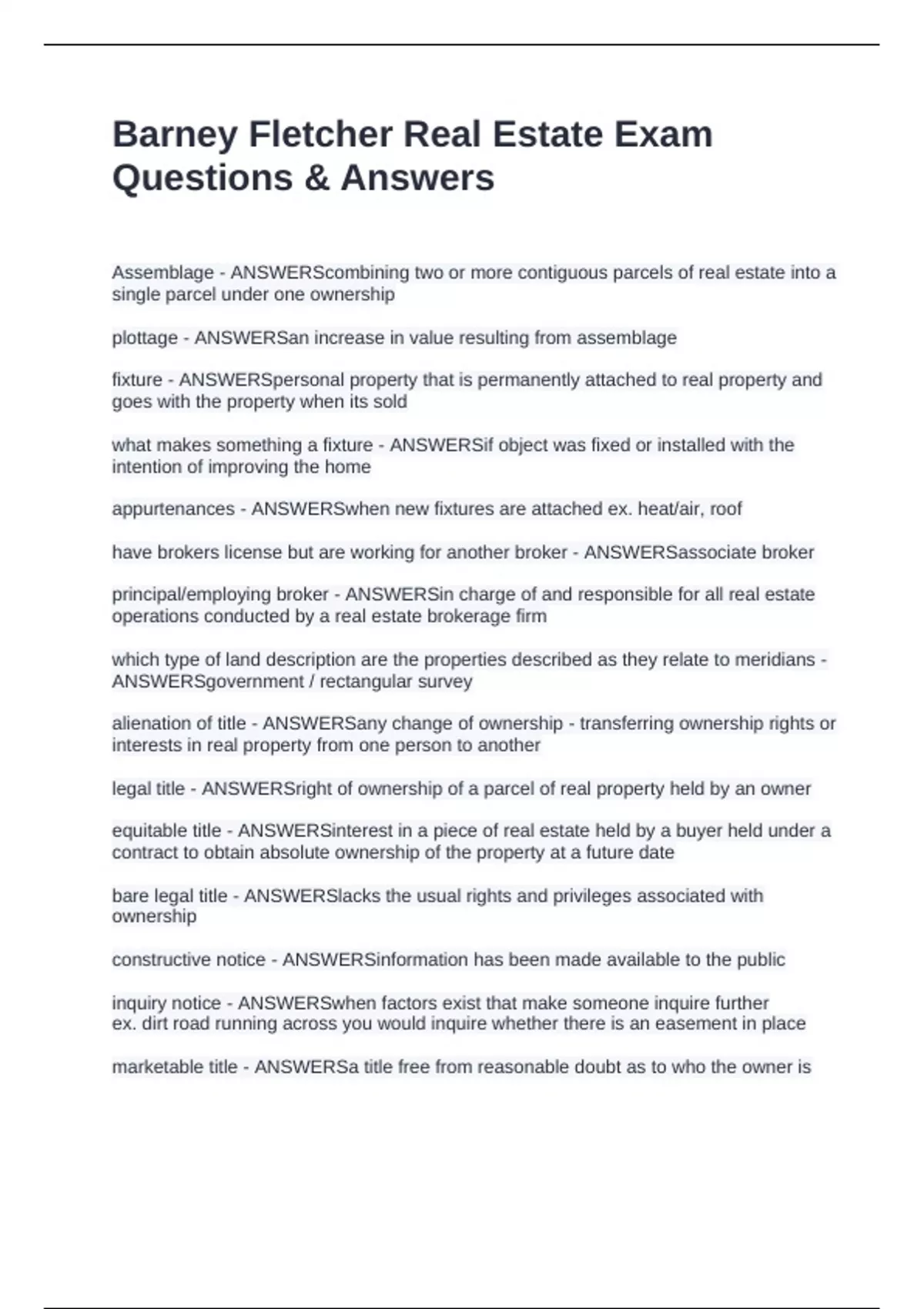 Barney Fletcher Real Estate Exam Questions & Answers