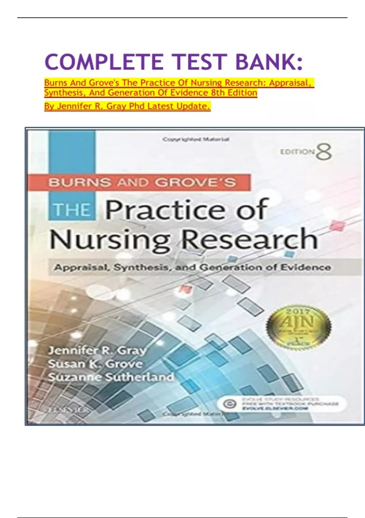 COMPLETE TEST BANK: Burns And Grove's The Practice Of Nursing Research: Appraisal, Synthesis, And Generation Of Evidence 8th Edition By Jennifer R. Gray Phd Latest Update.