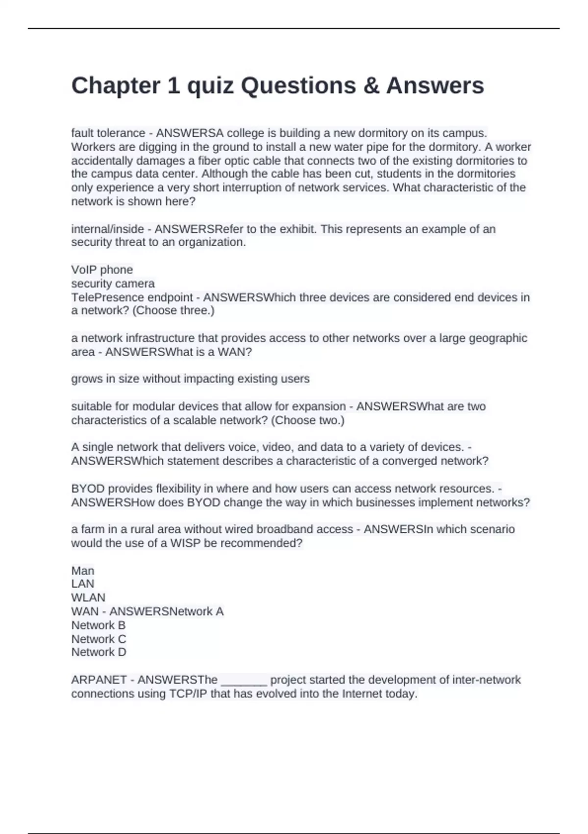 fault tolerance - ANSWERSA college is building a new dormitory on its campus. Workers are digging in the ground to install a new water pipe for the dormitory. A worker accidentally damages a fiber optic cable that connects two of the existing dormitories to the campus data center. Although the cable has been cut, students in the dormitories only experience a very short interruption of network services. What characteristic of the network is shown here? internal/inside - ANSWERSRefer to the exhibit. This represents an example of an security threat to an organization. VoIP phone security camera TelePresence endpoint - ANSWERSWhich three devices are considered end devices in a network? (Choose three.) a network infrastructure that provides access to other networks over a large geographic area - ANSWERSWhat is a WAN? grows in size without impacting existing users suitable for modular devices that allow for expansion - ANSWERSWhat are two characteristics of a scalable network? (Choose two.) A single network that delivers voice, video, and data to a variety of devices. - ANSWERSWhich statement describes a characteristic of a converged network? BYOD provides flexibility in where and how users can access network resources. - ANSWERSHow does BYOD change the way in which businesses implement networks? a farm in a rural area without wired broadband access - ANSWERSIn which scenario would the use of a WISP be recommended? Man LAN WLAN WAN - ANSWERSNetwork A Network B Network C Network D ARPANET - ANSWERSThe _______ project started the development of inter-network connections using TCP/IP that has evolved into the Internet today.