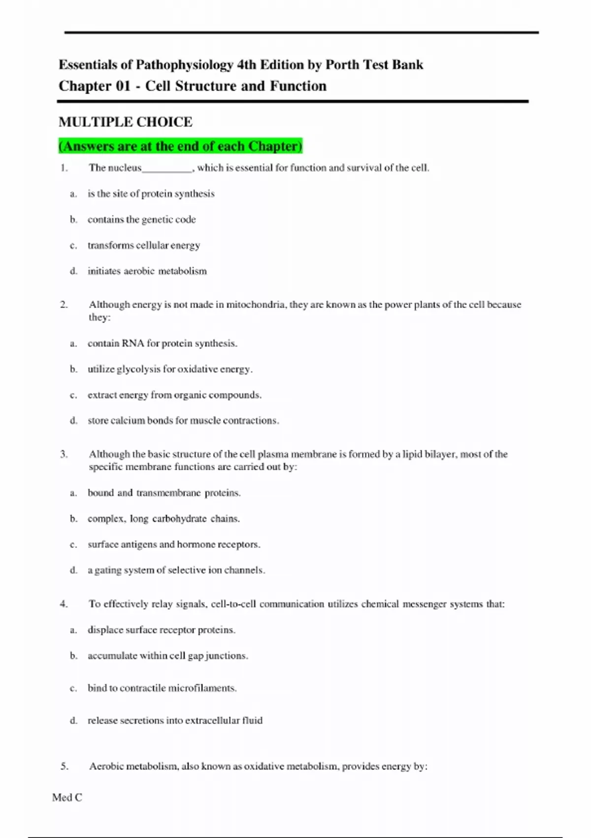 TEST BANK ESSENTIALS OF PATHOPHYSIOLOGY (4TH EDITION BY PORTH) CONTENTS Chapter 01 - Cell Structure and Function .......................................................................................................................... 2 Chapter 02 - Cellular Responses to Stress, Injury, and Aging...