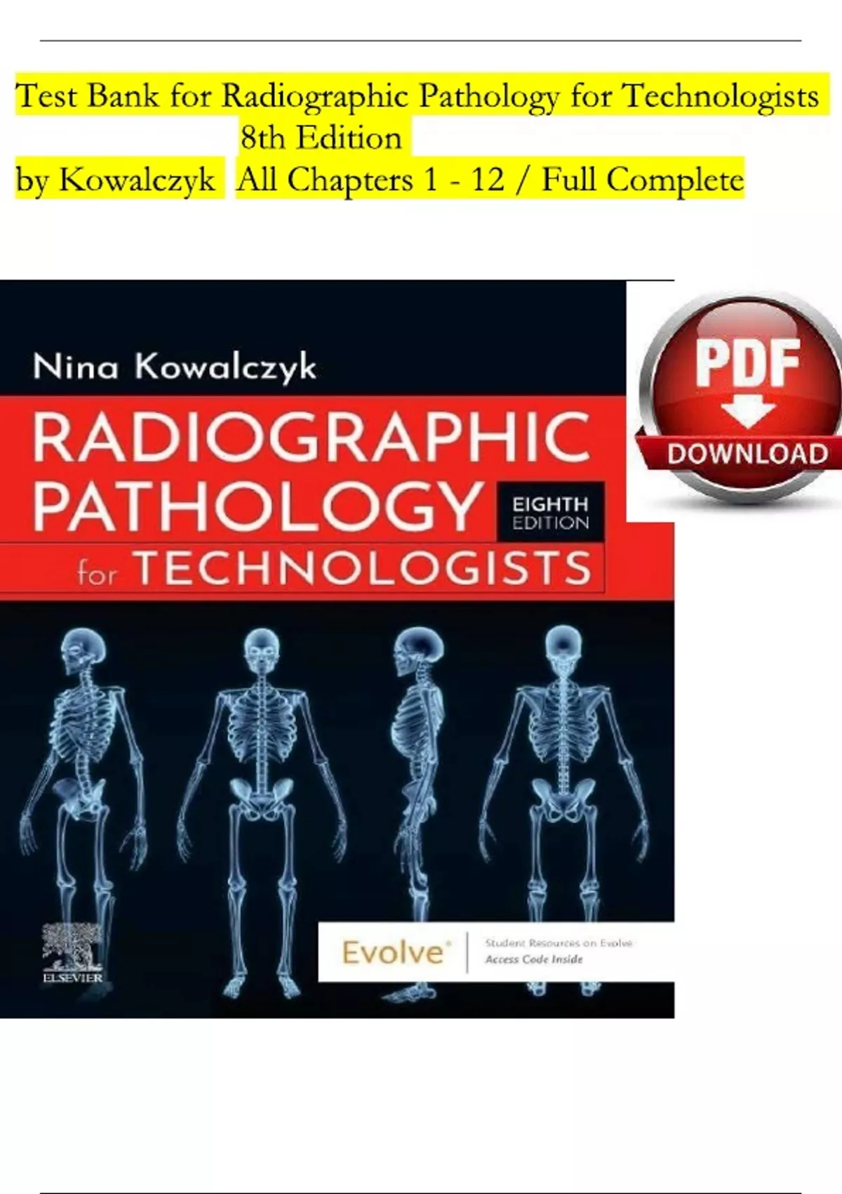 Test Bank For Radiographic Pathology for Technologists, 8th Edition by Nina Kowalczyk Test Bank For Radiographic Pathology for Technologists, 8th Edition by Nina Kowalczyk All Chapters 1-12 UPDATED