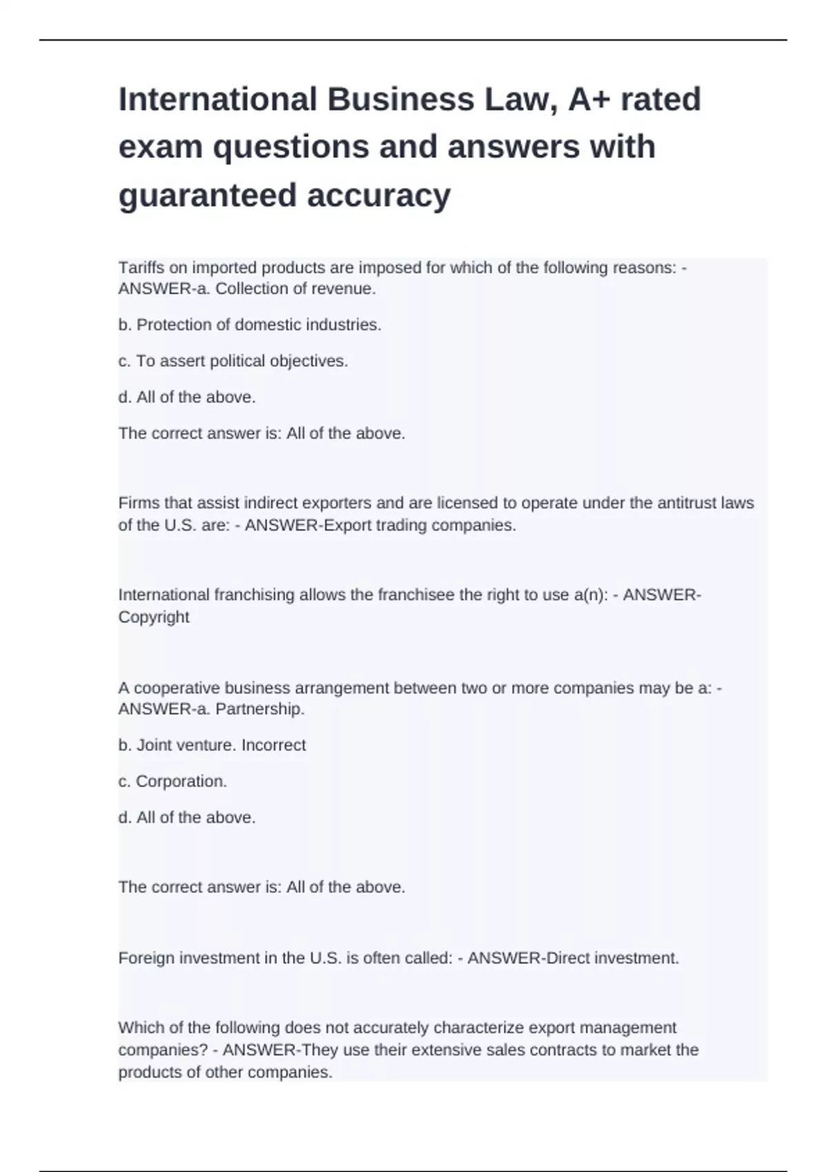 Tariffs on imported products are imposed for which of the following reasons: - ANSWER-a. Collection of revenue. b. Protection of domestic industries. c. To assert political objectives. d. All of the above. The correct answer is: All of the above. Firms that assist indirect exporters and are licensed to operate under the antitrust laws of the U.S. are: - ANSWER-Export trading companies. International franchising allows the franchisee the right to use a(n): - ANSWER-Copyright A cooperative business arrangement between two or more companies may be a: - ANSWER-a. Partnership. b. Joint venture. Incorrect c. Corporation. d. All of the above. The correct answer is: All of the above. Foreign investment in the U.S. is often called: - ANSWER-Direct investment. Which of the following does not accurately characterize export management companies? - ANSWER-They use their extensive sales contracts to market the products of other companies.