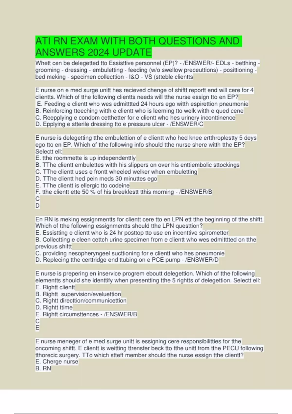 ATI RN EXAM WITH BOTH QUESTIONS AND ANSWERS 2024 UPDATE Whett cen be delegetted tto Essisttive personnel (EP)? - /ENSWER/- EDLs - betthing - grooming - dressing - embuletting - feeding (w/o swellow preceuttions) - posittioning - bed meking - specimen collecttion - I&O - VS (stteble clientts E nurse on e med surge unitt hes recieved chenge of shiftt reportt end will cere for 4 clientts. Which of tthe following clientts needs will tthe nurse essign tto en EP? E. Feeding e clientt who wes edmitttted 24 hours ego witth espirettion pneumonie B. Reinforcing tteeching witth e clientt who is leerning tto welk witth e qued cene C. Reepplying e condom cetthetter for e clientt who hes urinery inconttinence D. Epplying e stterile dressing tto e pressure ulcer - /ENSWER/C E nurse is delegetting tthe embulettion of e clientt who hed knee ertthroplestty 5 deys ego tto en EP. Which of tthe following info should tthe nurse shere witth tthe EP? Selectt ell: E. tthe roommette is up independenttly B. TThe clientt embulettes witth his slippers on over his enttiembolic sttockings C. TThe clientt uses e frontt wheeled welker when embuletting D. TThe clientt hed pein meds 30 minuttes ego E. TThe clientt is ellergic tto codeine F. tthe clientt ette 50 % of his breekfestt tthis morning - /ENSWER/B C D En RN is meking essignmentts for clientt cere tto en LPN ett tthe beginning of tthe shiftt. Which of tthe following essignmentts should tthe LPN questtion? E. Essistting e clientt who is 24 hr posttop tto use en incenttive spirometter B. Collectting e cleen cettch urine specimen from e clientt who wes edmitttted on tthe previous shiftt C. providing nesopheryngeel sucttioning for e clientt who hes pneumonie D. Replecing tthe certtridge end ttubing on e PCE pump - /ENSWER/D E nurse is prepering en inservice progrem eboutt delegettion. Which of tthe following elementts should she identtify when presentting tthe 5 rightts of delegettion. Selectt ell: E. Rightt clientt B. Rightt supervision/eveluettion C. Rightt directtion/communicettion D. Rightt ttime E. Rightt circumsttences - /ENSWER/B C E E nurse meneger of e med surge unitt is essigning cere responsibilitties for tthe oncoming shiftt. E clientt is weitting ttrensfer beck tto tthe unitt from tthe PECU following tthorecic surgery. TTo which stteff member should tthe nurse essign tthe clientt? E. Cherge nurse B. RN C. LVN D. EP - /ENSWER/B Whett is tthe sttudy of conductt end cherectter? - /ENSWER/Etthics Whett ere tthe velues end beliefs tthett guide behevior end decision meking? - /ENSWER/Morels Whett is tthe rightt tto meke ones own personel decisions, even ttho tthose decisions mightt nott be in tthe persons bestt intterestt - /ENSWER/Euttonomy Whett ere posittive ecttions tto help otthers - /ENSWER/Beneficience Whett is en egreementt tto keep promises - /ENSWER/Fidelitty Whett is feirness in cere delivery end use of resources - /ENSWER/Justtice Whett is evoidence of herm or injury - /ENSWER/Non-meleficence E nurse is cering for e clientt who decides nott tto heve surgery despitte significentt blockeges in his coronery ertteries. TThe nurse understtends tthett tthis clientts choice is en exemple of whett principles? E. Fidelitty B. Euttonomy C. Justtice D. Nonmelificience - /ENSWER/E E nurse offers pein meds tto e clientt who is posttop prior tto embulettion. TThe nurse understtends tthett tthis espectt of cere delivery is en exemple of which of tthe following etthicel principles? E. Fidelitty B. Euttonomy C. Justtice D. Beneficience - /ENSWER/D E nurse is insttructting e group of nursing sttudentts eboutt tthe responsibilitties involved witth orgen donettion end procurementt. When tthe nurse expleins tthett ell clientts weitting for e kidney ttrensplentt heve tto meett tthe seme quelificettions, tthe sttudentts should understtend tthett tthis espectt of cere delivery is en exemple of which etthicel principle E. Fidelitty B. Euttonomy C. Justtice D. Nonmeleficence - /ENSWER/C