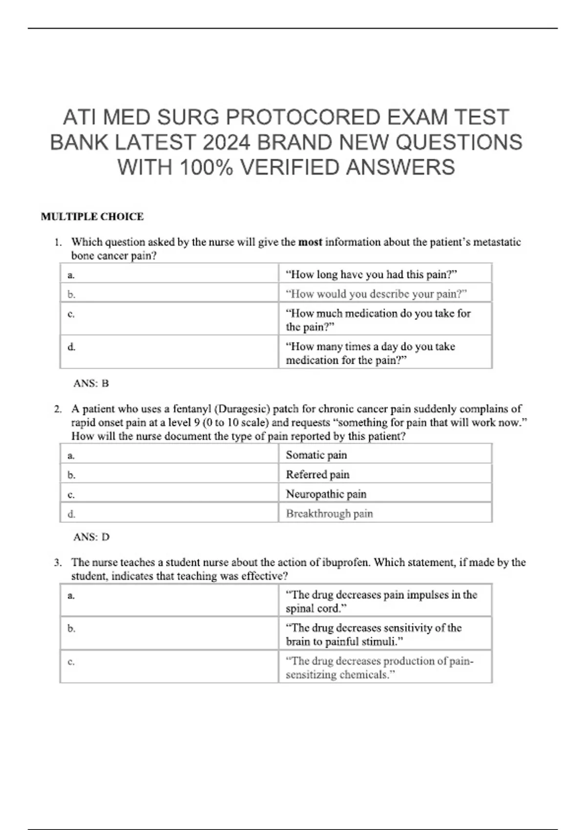 ATI MED SURG PROTOCORED EXAM TEST BANK LATEST 2024 BRAND NEW QUESTIONS WITH 100 VERIFIED ANSWERS