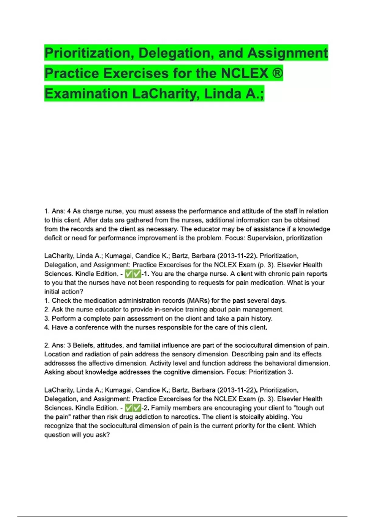Prioritization, Delegation, and Assignment Practice Exercises for the NCLEX_ ® Examination LaCharity, Linda A.; Kumagai, Candice K.; Bartz, Barbara ().