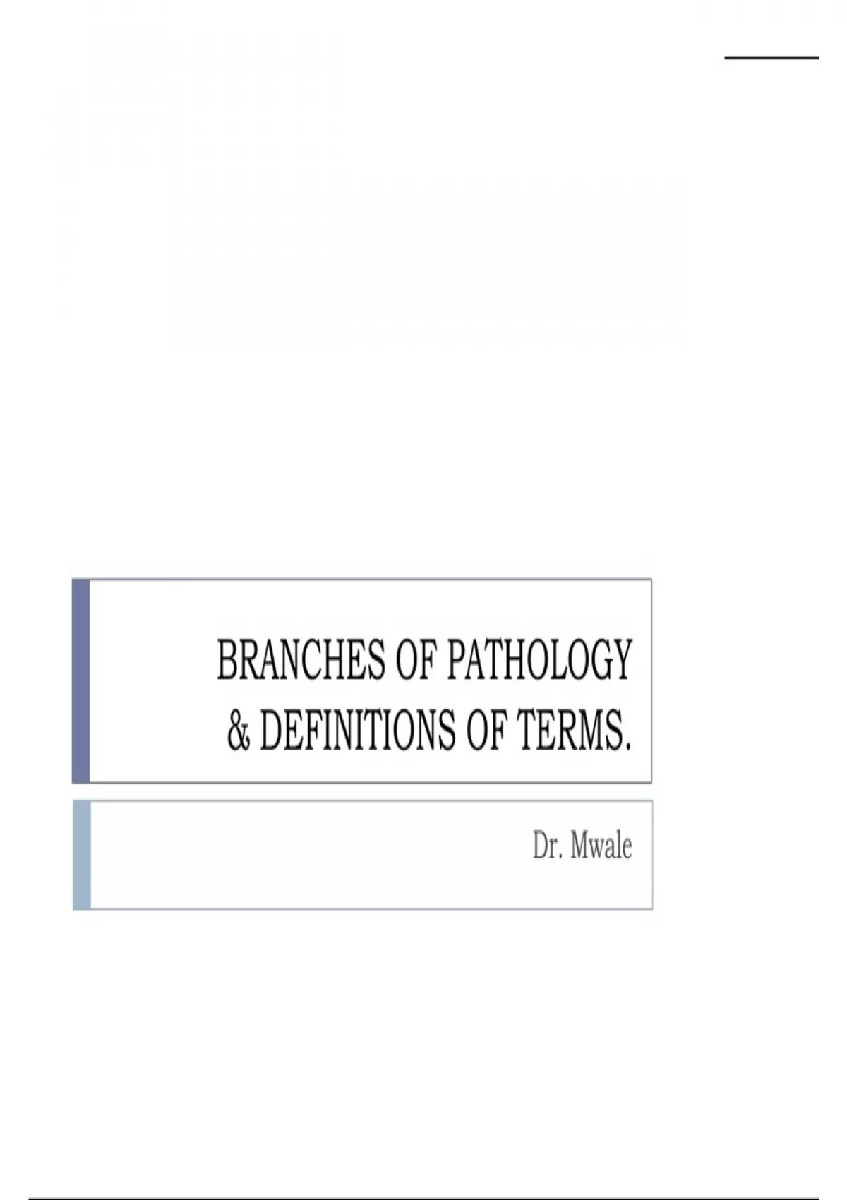 BRANCHES OF PATHOLOGY & DEFINITIONS OF TERMS. Dr. Mwale  There are two main branches of pathology: 1) General pathology: Focuses on the fundamental cellular and tissue responses to pathological stimuli. Eg inflammation, tumours or degenerations. 2) Systemic pathology: The descriptions of specific diseases as they affect individual organs or organ systems eg appendicitis, lung cancer and atheroma. Subdivisions of pathology  Gross pathology: aka macroscopic pathology, pathological anatomy, morbid anatomy. Refers to the study of disease in which tissues and organs are examined with the unaided eye.  Cellular pathology: aka microscopic pathology, histopathology, cytopathology. Refers to the study of diseased tissues and organs with the aid of a microscope.  Clinical pathology: Study of disease by examination of blood, urine, faeces, skin, scrapings etc.  Immunopathology: Study of diseases associated with abnormalities of the immune mechanisms of the body.  Forensic pathology: Study of causes and manner of death