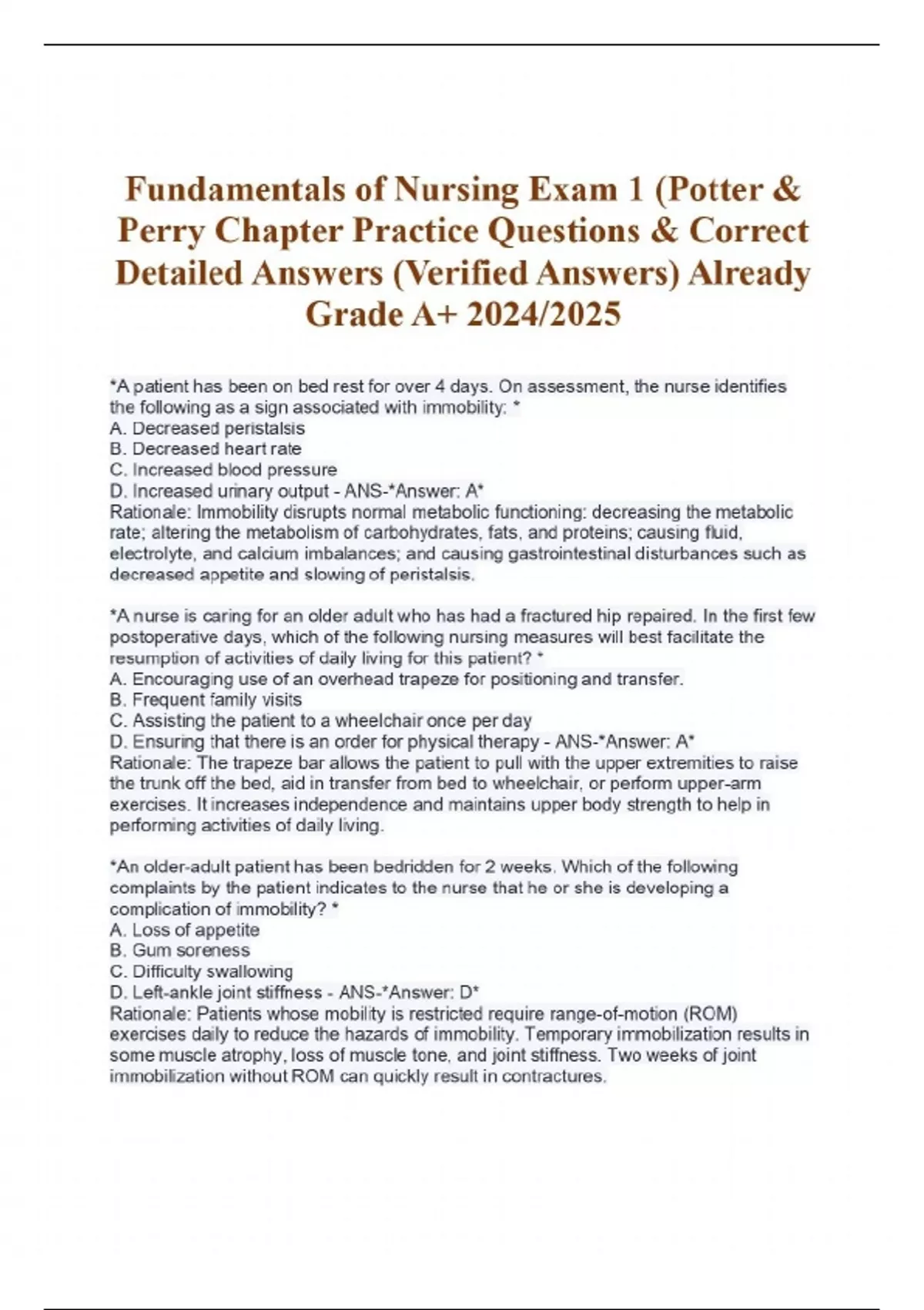 Fundamentals of Nursing Exam 1 (Potter & Perry Chapter Practice Questions & Correct Detailed Answers (Verified Answers) Already Grade A+ 2024/2025 *A patient has been on bed rest for over 4 days. On assessment, the nurse identifies the following as a sign associated with immobility: * A. Decreased peristalsis B. Decreased heart rate C. Increased blood pressure D. Increased urinary output - ANS-*Answer: A* Rationale: Immobility disrupts normal metabolic functioning: decreasing the metabolic rate; altering the metabolism of carbohydrates, fats, and proteins; causing fluid, electrolyte, and calcium imbalances; and causing gastrointestinal disturbances such as decreased appetite and slowing of peristalsis. *A nurse is caring for an older adult who has had a fractured hip repaired. In the first few postoperative days, which of the following nursing measures will best facilitate the resumption of activities of daily living for this patient? * A. Encouraging use of an overhead trapeze for positioning and transfer. B. Frequent family visits C. Assisting the patient to a wheelchair once per day D. Ensuring that there is an order for physical therapy - ANS-*Answer: A* Rationale: The trapeze bar allows the patient to pull with the upper extremities to raise the trunk off the bed, aid in transfer from bed to wheelchair, or perform upper-arm exercises. It increases independence and maintains upper body strength to help in performing activities of daily living. *An older-adult patient has been bedridden for 2 weeks. Which of the following complaints by the patient indicates to the nurse that he or she is developing a complication of immobility? * A. Loss of appetite B. Gum soreness C. Difficulty swallowing D. Left-ankle joint stiffness - ANS-*Answer: D* Rationale: Patients whose mobility is restricted require range-of-motion (ROM) exercises daily to reduce the hazards of immobility. Temporary immobilization results in some muscle atrophy, loss of muscle tone, and joint stiffness. Two weeks of joint immobilization without ROM can quickly result in contractures. *The nurse is caring for a patient whose calcium intake must increase because of high risk factors for osteoporosis. Which of the following menus should the nurse recommend? * A. Cream of broccoli soup with whole wheat crackers, cheese, and tapioca for dessert B. Hot dog on whole wheat bun with a side salad and an apple for dessert C. Low-fat turkey chili with sour cream with a side salad and fresh pears for dessert D. Turkey salad on toast with tomato and lettuce and honey bun for dessert - ANS- *Answer: A* Rationale: Teach patient and/or caregiver the current recommended dietary allowances for calcium and review foods high in calcium (e.g., milk fortified with vitamin D, leafy green vegetables, yogurt, and cheese). *A patient on prolonged bed rest is at an increased risk to develop this common complication of immobility if preventive measures are not taken:* A. Myoclonus B. Pathological fractures C. Pressure ulcers D. Pruritus - ANS-*Answer: C* Rationale: Immobility is a major risk factor for pressure ulcers. Any break in the integrity of the skin is difficult to heal. Preventing a pressure ulcer is much less expensive than treating one; therefore preventive nursing interventions are imperative. *To prevent complications of immobility, what would be the most effective activity on the first postoperative day for a patient who has had abdominal surgery?* A. Turn, cough, and deep breathe every 30 minutes while awake B. Ambulate patient to chair in the hall C. Passive range of motion 4 times a day D. Immobility is not a concern the first postoperative day - ANS-*Answer: B* Rationale: Prevention of complications of immobility begins when the patient becomes immobilized. Every 30 minutes is not necessary and disruptive to the healing process. Active patient participation in exercises is more beneficial to preventing venous stasis. *Which of the following nursing interventions should be implemented to maintain a patent airway in a patient on bed rest?* A. Isometric exercises B. Administration of low-dose heparin C. Suctioning every 4 hours D. Use of incentive spirometer every 2 hours while awake - ANS-*Answer: D* Rationale: Incentive spirometry opens the airway, preventing atelectasis. *What is the correct order in which elastic stockings should be applied? 1. Identify patient using two identifiers. 2. Smooth any creases or wrinkles. 3. Slide the remainder of the stocking over the patient's heel and up the leg 4. Turn the stocking inside out until heel is reached. 5. Assess the condition of the patient's skin and circulation of the legs. 6. Place toes into foot of the stocking. 7. Use tape measure to measure patient's legs to determine proper stocking size.* A. 1, 5, 7, 4, 6, 2, 3 B. 1, 7, 5, 4, 6, 2, 3 C. 1, 5, 7, 4, 6, 3, 2 D. 1, 5, 4, 7, 6, 3, 2 - ANS-*Answer: C* *Which of the following are physiological outcomes of immobility?* A. Increased metabolism B. Reduced cardiac workload C. Decreased lung expansion D. Decreased oxygen demand - ANS-*Answer: C* Rationale: Physiologic outcomes of immobility include decreased metabolism, increased cardiac workload, decreased lung expansion, and increased oxygen demand. *An older adult has limited mobility as a result of a total knee replacement. During assessment you note that the patient has difficulty breathing while lying flat. Which of the following assessment data support a possible pulmonary problem related to impaired mobility? (Select all that apply.)* A. B/P = 128/84 B. Respirations 26/min on room air C. HR 114 D. Crackles over lower lobes heard on auscultation E. Pain reported as 3 on scale of 0 to 10 after medication - ANS-*Answer: B, C, D* Rationale: Patients who are immobile are at high risk for developing pulmonary complications. The most common respiratory complications are atelectasis (collapse of alveoli) and hypostatic pneumonia (inflammation of the lung from stasis or pooling of secretions)