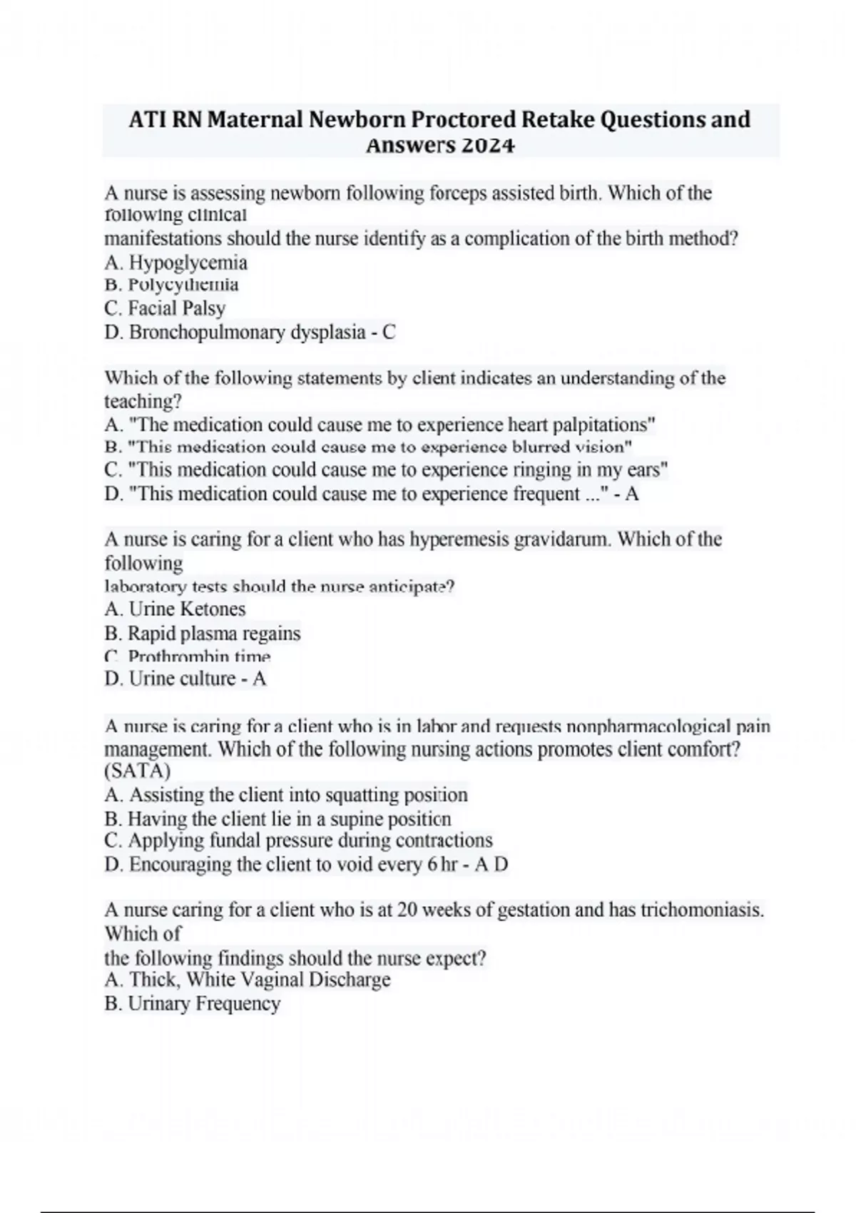 A nurse is assessing newborn following forceps assisted birth. Which of the following clinical manifestations should the nurse identify as a complication of the birth method? A. Hypoglycemia B. Polycythemia C. Facial Palsy D. Bronchopulmonary dysplasia - C Which of the following statements by client indicates an understanding of the teaching? A. "The medication could cause me to experience heart palpitations" B. "This medication could cause me to experience blurred vision" C. "This medication could cause me to experience ringing in my ears" D. "This medication could cause me to experience frequent ..." - A A nurse is caring for a client who has hyperemesis gravidarum. Which of the following laboratory tests should the nurse anticipate? A. Urine Ketones B. Rapid plasma regains C. Prothrombin time D. Urine culture - A A nurse is caring for a client who is in labor and requests nonpharmacological pain management. Which of the following nursing actions promotes client comfort? (SATA) A. Assisting the client into squatting position B. Having the client lie in a supine position C. Applying fundal pressure during contractions D. Encouraging the client to void every 6 hr - A D A nurse caring for a client who is at 20 weeks of gestation and has trichomoniasis. Which of the following findings should the nurse expect? A. Thick, White Vaginal Discharge B. Urinary Frequency ATI RN Maternal Newborn Proctored Retake Questions and Answers 2024 C. Vulva Lesions D. Malodorous Discharge - D A nurse is caring for a client who is 14 weeks of gestation. At which the following locations should the nurse place the Doppler device when assessing the fetal heart rate? A. Midline 2 to 3 cm (0.8 to 1.2 in) above the symphysis pubis B. Left Upper Abdomen C. Two fingerbreadths above the umbilicus D. Lateral at the Xiphoid Process - A A nurse is assessing a client who is at 27 weeks of gestation and has preeclampsia. Which of the following findings should the nurse report to the provider? A. Urine protein contraction 200mg/24 hours B. Creatine 0.8 C. Hemoglobin 14.8 D. Platelet 60,000 - D A nurse is teaching about clomiphene citrate to a client who is experiencing infertility. Which of the following adverse effects should the nurse include? A. Tinnitus B. Urinary Frequency C. Breast Tenderness D. Chills - C (vision disturbances). A nurse is assessing a newborn upon admission to the nursery. Which of the following should the nurse expect? A. Bulging fontanelles B. Nasal flaring C. Length from head to heel of 40cm D. Chest circumference 2c (smaller than the head circumference - D A nurse is planning care for a newborn who has necrotizing abstinence syndrome. Which of the following interventions should the nurse include in the plan of care? A.Increase the newborn visual stimulation B. Weigh the newborn everyday C. Discourage parental interaction after a social evaluation D. Swaddle the newborn in a flexed position - D A nurse is caring for a newborn who his 6 hours old had has a bedside glucometer reading of 65mg/dl. The newborns mother has type 2 diabetes mellitus. Which of the following actions should the nurse take. A. obtain a blood sampling for a serum glucose level. B. Feed the newborn immediately C. Administer 50ml of dextrose D. Reassess the blood glucose reading prior to the next feeding - D A nurse is providing teaching to a client about exercise safety during pregnancy. Which of the folioing statements by the client indicates an understanding of the teaching (SATA)? A. I will limit my time in the hot tub to 30 miniutes after exercise B. I should consume three 8 ounce glasses of water after I exercise C. I will check my heart rate every 15 minutes during D. I should limit exercise sessions to 30 minutes when the weather is humid E. I should rest by lying on my side for 10 minutes following exercise. - B D E A charge nurse is teaching a group of staff nurses about fetal monitoring during labor. Which of the following findings should the charge nurse instruct the staff members to report to the provider? A. Contractions duration 95 seconds to 100 seconds B. Contraction frequency 2-3 minutes C. Absent early decelerations of fetal heart rate - C A nurse in a woman's health clinic is obtaining a health history from a client. Which of the following findings should the nurse identify as increasing the client's risk for developing pelvic inflammatory disease (PID)? A. Recurrent Cystitis B. Frequent Alcohol Use C. Use of Oral Contraceptives D. Chlamydia Infection - D A nurse is teaching a prenatal class about immunizations that newborns receive following birth. Which of the following immunizations should the nurse include in the teaching? A. Hepatitis B B. Rotavirus C. Pneumococcal D. Varicella - A A nurse is providing nutritional guidance to a client who is pregnant and follows a vegan diet. The client asks the nurse which foods she should eat to ensure adequate calcium intake. The nurse should instruct the client that which of the following foods has the highest amount of calcium? A. ½ cup cubed avocado B. 1 large banana C. 1 medium potato D. 1 cup cooked broccoli - D A nurse in a provider's office is assessing a client at her first antepartum visit. The client states that the first day of her last menstrual period was March 8. - December 15 A nurse is caring for a client who is in the second stage of labor. Which of the following manifestations should the nurse expect? A. The client expels the placenta B. The client experiences gradual dilation of the cervix C. The client begins have regular contractions. D. The client delivers the newborn - D A nurse is assessing a client who is at 37 weeks of gestation. Which of the following statements by the client requires immediate intervention by the nurse? A. "It burns when I urinate B. "My feet are really swollen today". - A A nurse is providing discharge teaching to a new parent about car seat safety. Which of the following statements by the parent indicates an understanding