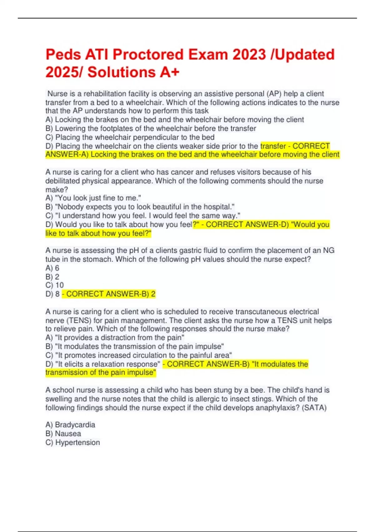 Learning System RN 3.0 Nursing Care of Children Final Exam/ Questions & Answers Newest 2025 A nurse is caring for a child who has suspected nephrotic syndrome. Which of the following laboratory values should the nurse expect? - CORRECT ANSWER-Serum cholesterol 700mg/dL A nurse is preparing to administer acetaminophen 240mg PO daily to a child who has a temperature of 38.9 C (102 F). The amount available is acetaminophen oral solution 160mg/5ml. How many ml should the nurse administer per dose? - CORRECT ANSWER-7.5 ml A nurse is caring for a 6-month-old infant who has intussusception. Which of the following actions should the nurse take? - CORRECT ANSWER-Prepare the child for a barium enema A nurse is caring for a school-age child who has glomerulonephritis. The child has decreased urinary output, a blood pressure of 160/78 mmHg, and is receiving hydralazine. Which of the following lunch choices should the nurse recommend? - CORRECT ANSWER-3 oz grilled chicken, 1 cup of pear slices, and 120 ml (4oz) of apple juice A nurse is teaching the parents of a child who has rheumatic fever. Which of the following statements by a parent indicates an understanding of the teaching? - CORRECT ANSWER-My child may take aspirin for his joint pain A nurse at a clinic is preparing to administer immunizations to a 5-year-old child. Which of the following immunizations should the nurse plan to give? - CORRECT ANSWER-Diphtheria, tetanus, and pertussis (DTaP) A nurse is caring for a child who has cystic fibrosis and a pulmonary infection. Which of the following finding sis the nurse's priority? - CORRECT ANSWER-Inability to clear secretions A nurse is teaching a parent of an infant who has a colostomy. Which of the following statements by the parent indicates an understanding of the teaching? - CORRECT ANSWER-I need to apply paste to the back of the wafer of my child's appliance A nurse is preparing a school-age child for a tonsillectomy. Which of the following actions should the nurse take? - CORRECT ANSWER-Schedule the child for a preoperative visit to the facility