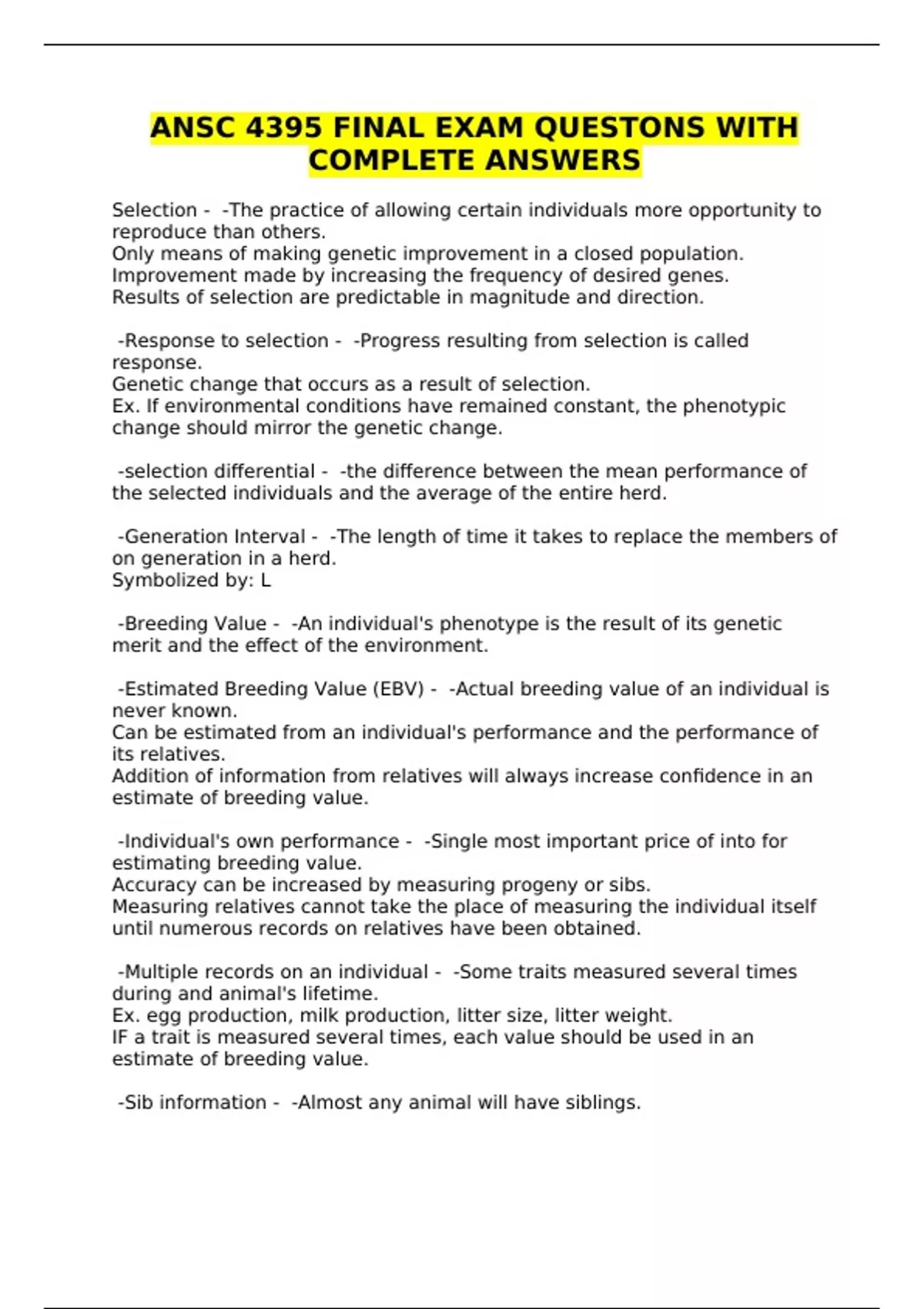 ANSC 4395 FINAL EXAM QUESTONS WITH COMPLETE ANSWERS