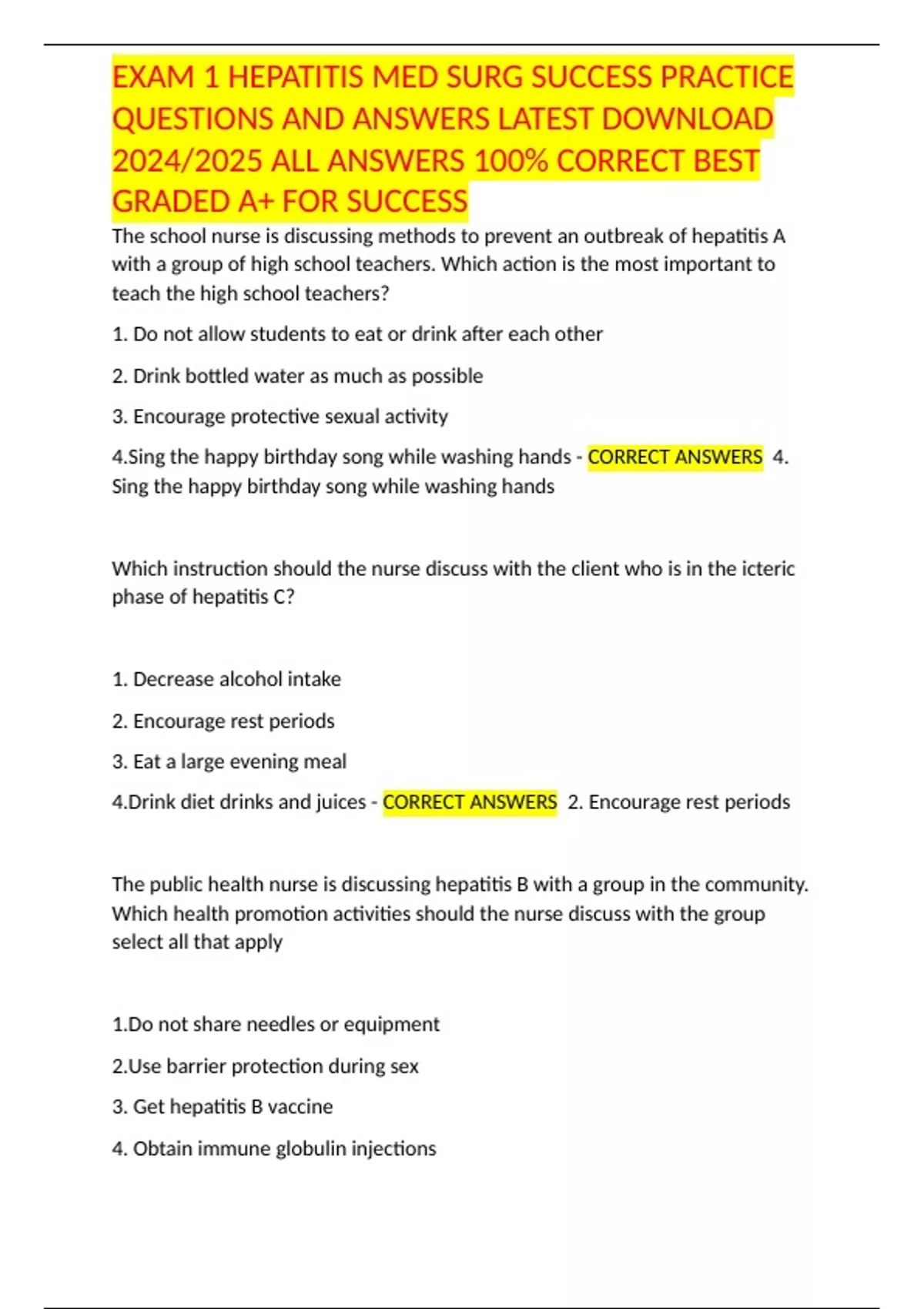 EXAM 1 HEPATITIS MED SURG SUCCESS PRACTICE QUESTIONS AND ANSWERS LATEST DOWNLOAD 2024/2025 ALL ANSWERS 100% CORRECT BEST GRADED A+ FOR SUCCESS