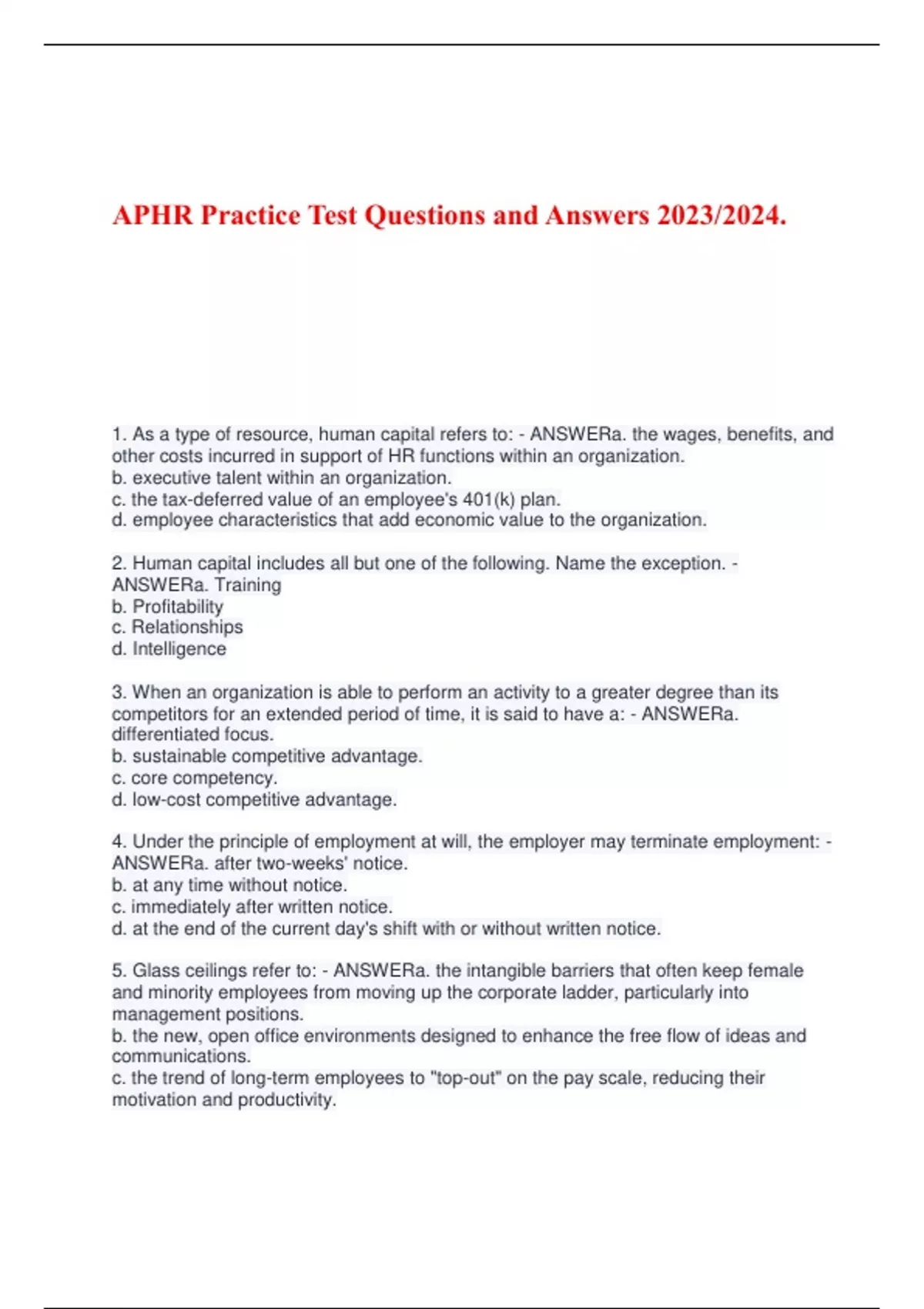 1. As a type of resource, human capital refers to: - ANSWERa. the wages, benefits, and