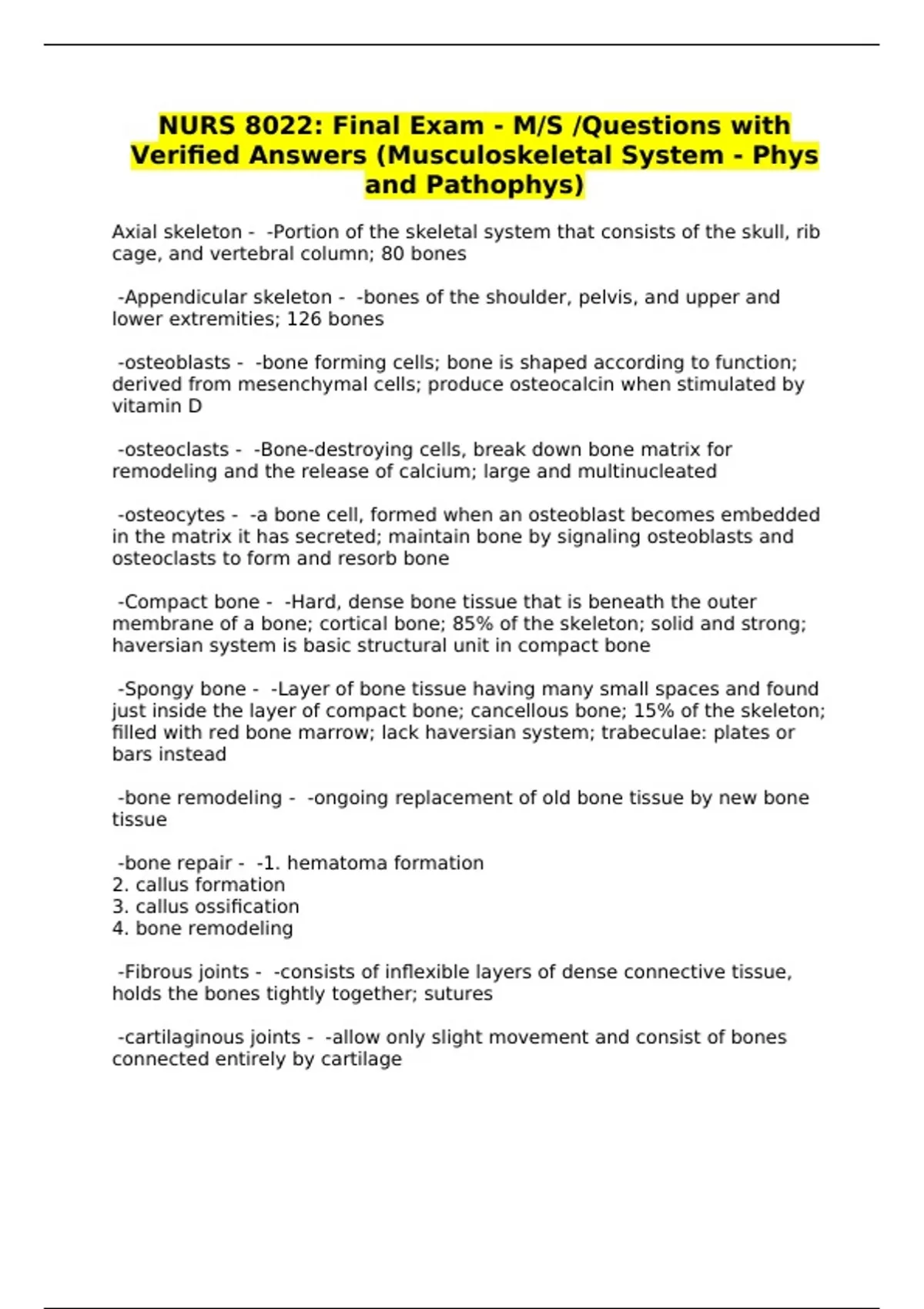 NURS 8022: Final Exam - M/S /Questions with Verified Answers (Musculoskeletal System - Phys and Pathophys)