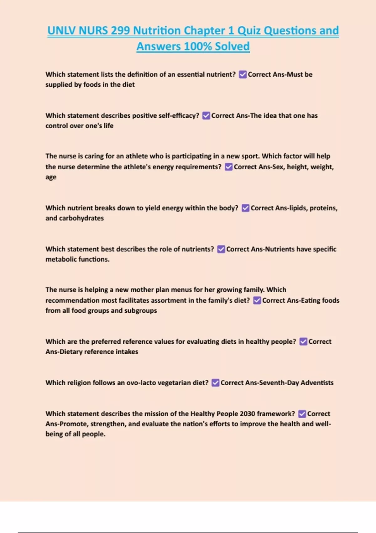 , UNLV NURS 299 Nutrition Chapter 1 Quiz Questions and